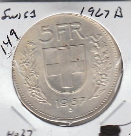 SWISS SILVER .4027 1967-B 5 FRANCS