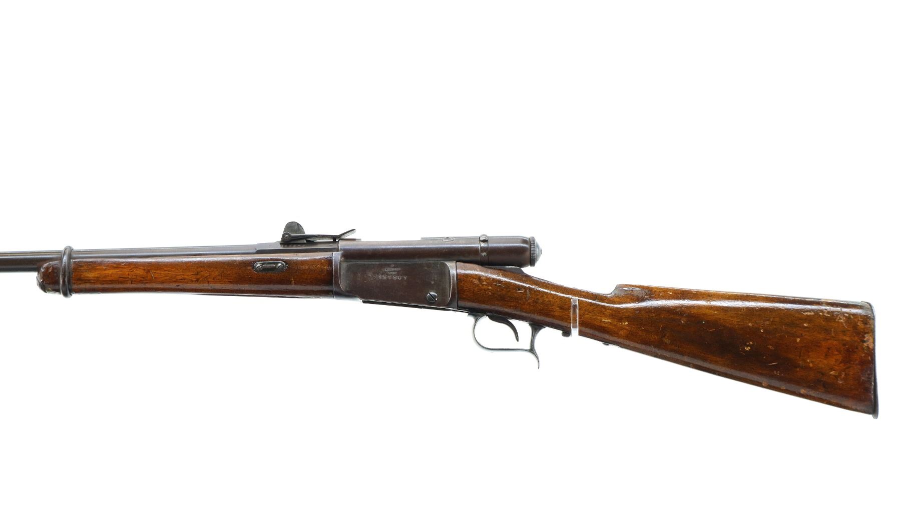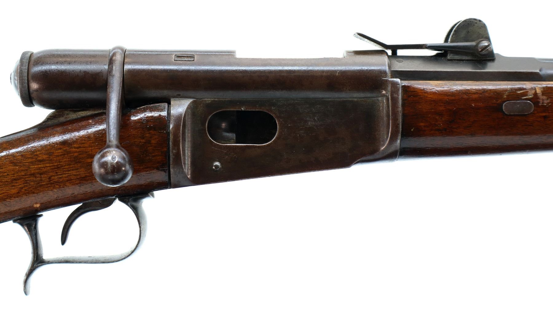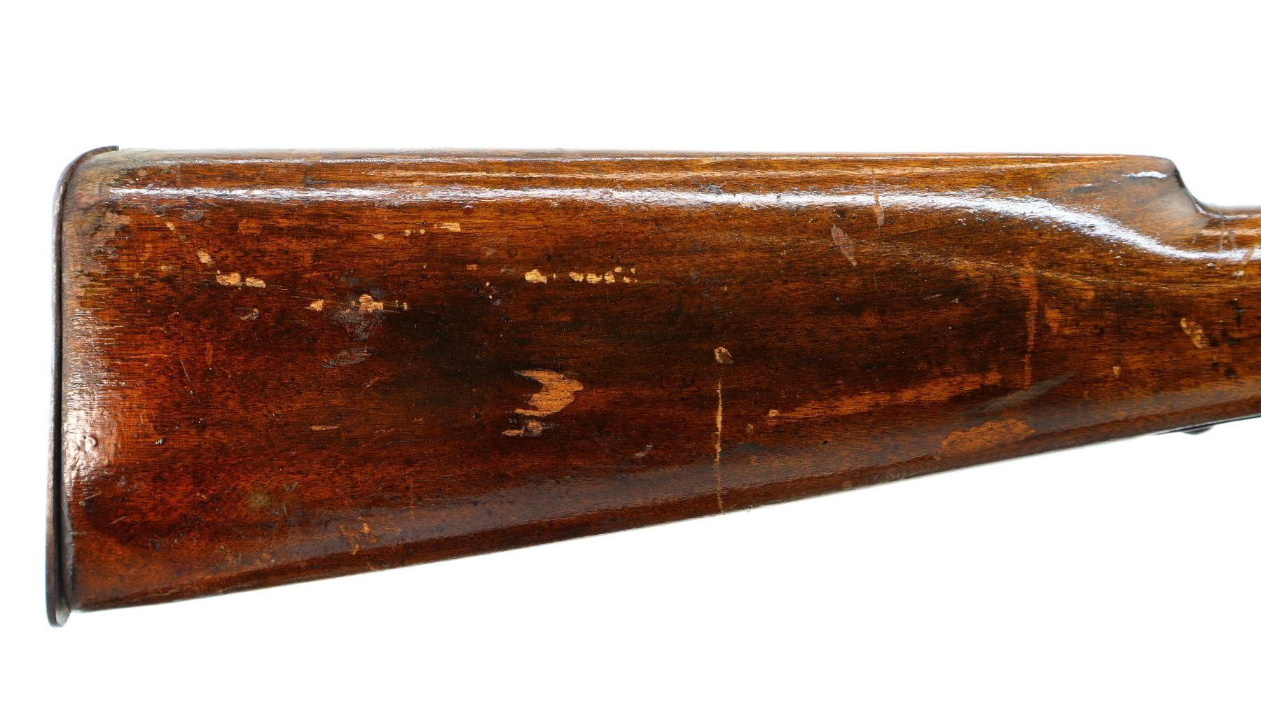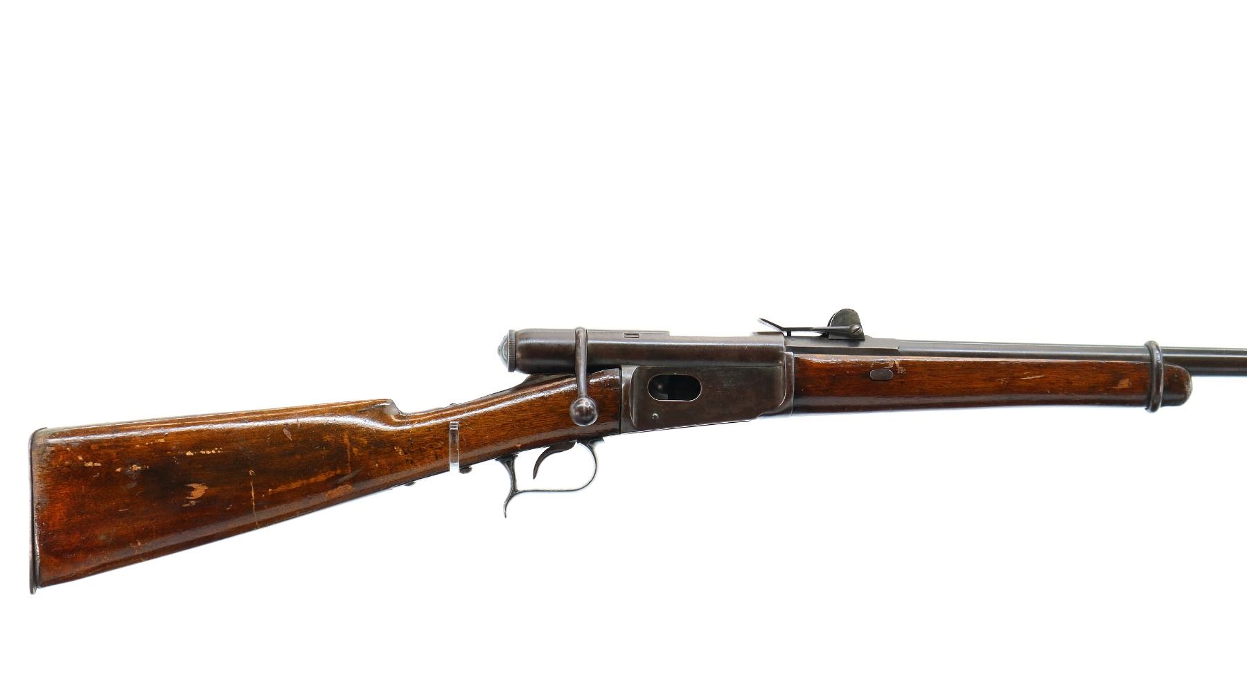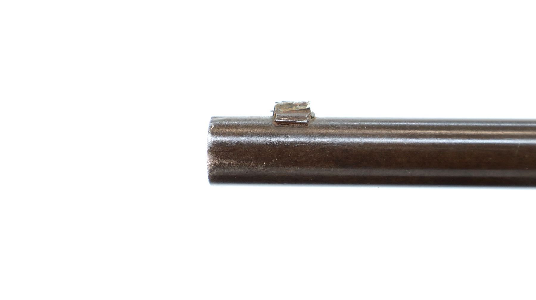 Main Description: Serial numbers mismatched. Broken blade front sight, adjustable u notched rear sight, shortened round barrel, smooth bolt knob, missing elevator and possibly other internal parts. Two piece sporterized wood stocks, forend tip is chipped and cracked, straight grip cracked behind receiver, smooth steel butt plate, finger rest trigger guard.