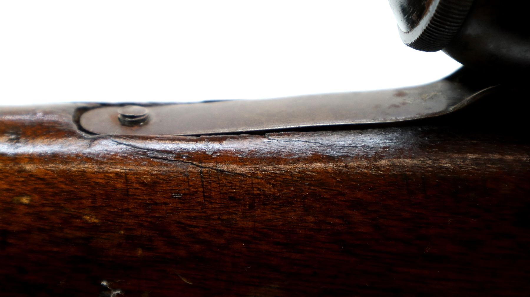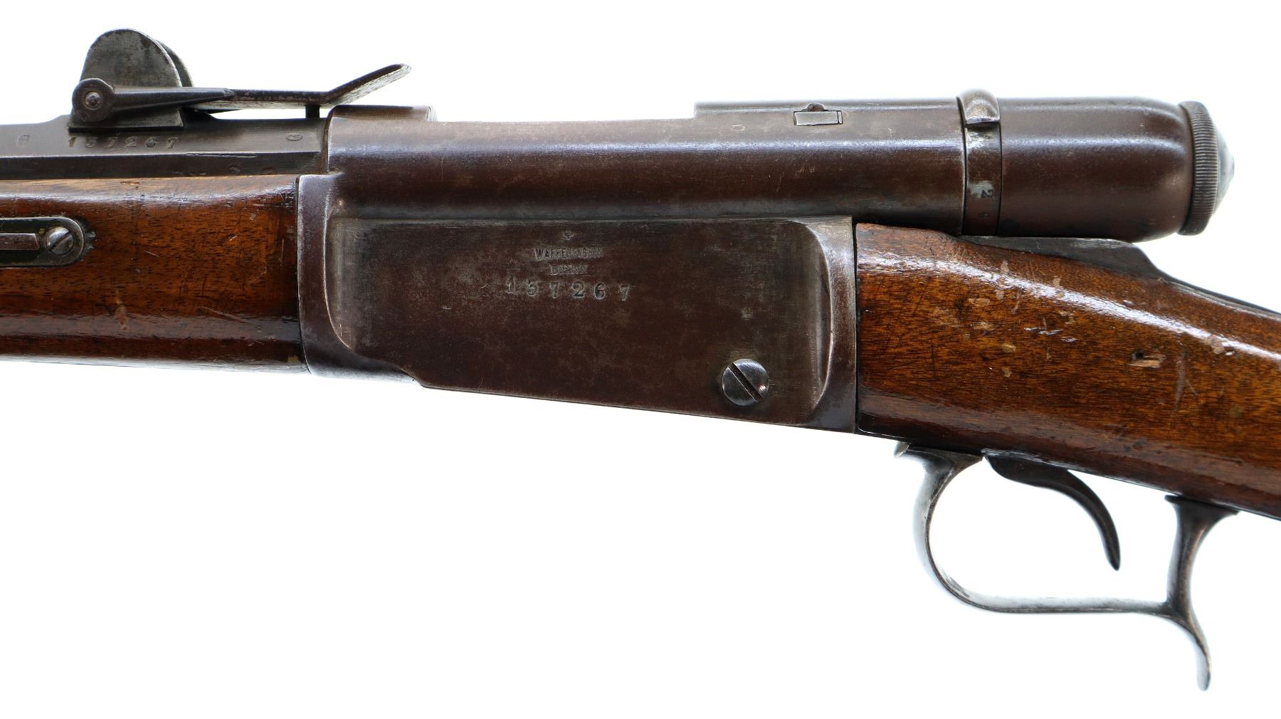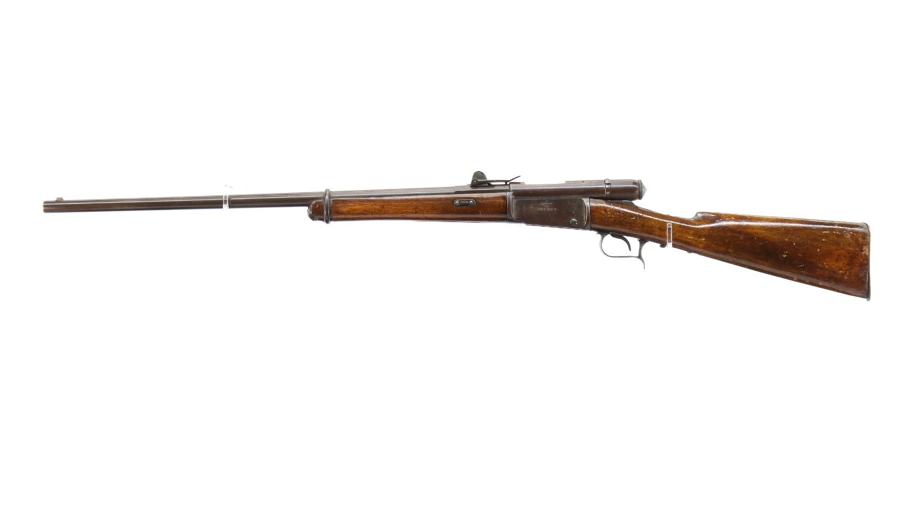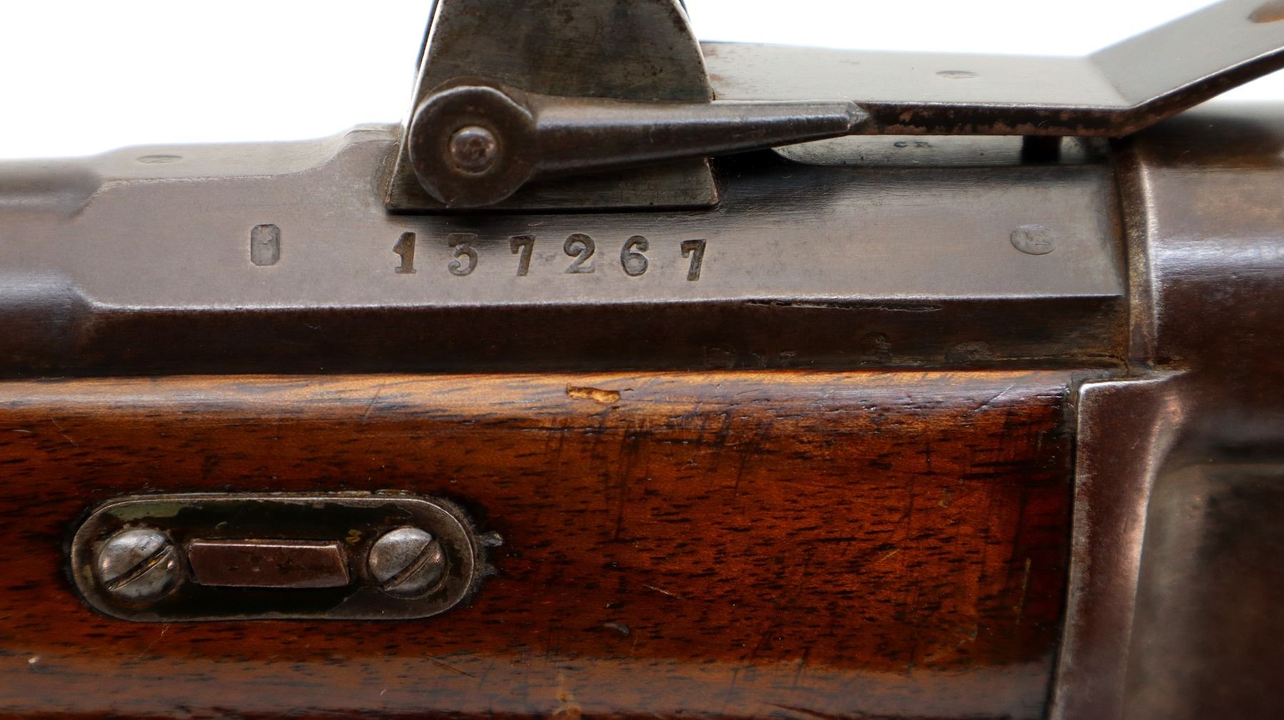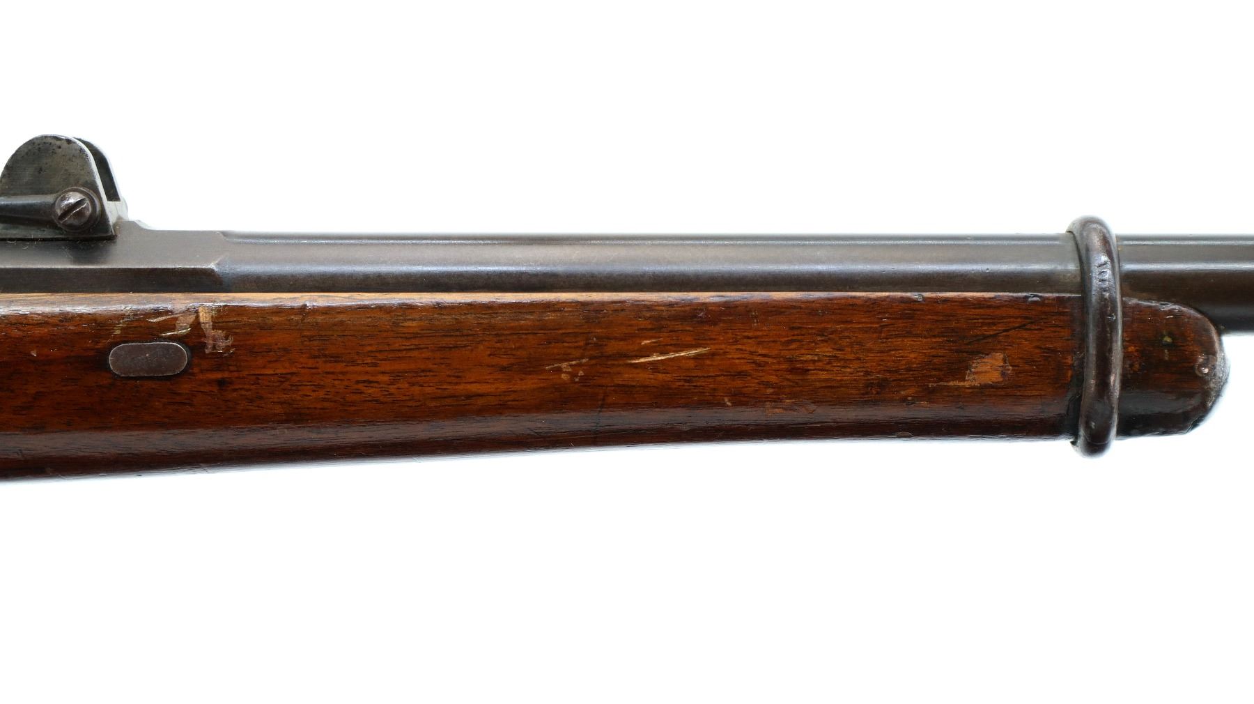 Main Description: Serial numbers mismatched. Broken blade front sight, adjustable u notched rear sight, shortened round barrel, smooth bolt knob, missing elevator and possibly other internal parts. Two piece sporterized wood stocks, forend tip is chipped and cracked, straight grip cracked behind receiver, smooth steel butt plate, finger rest trigger guard.