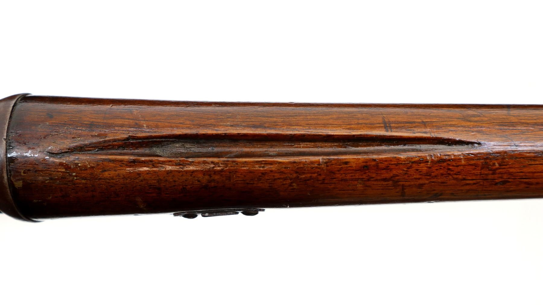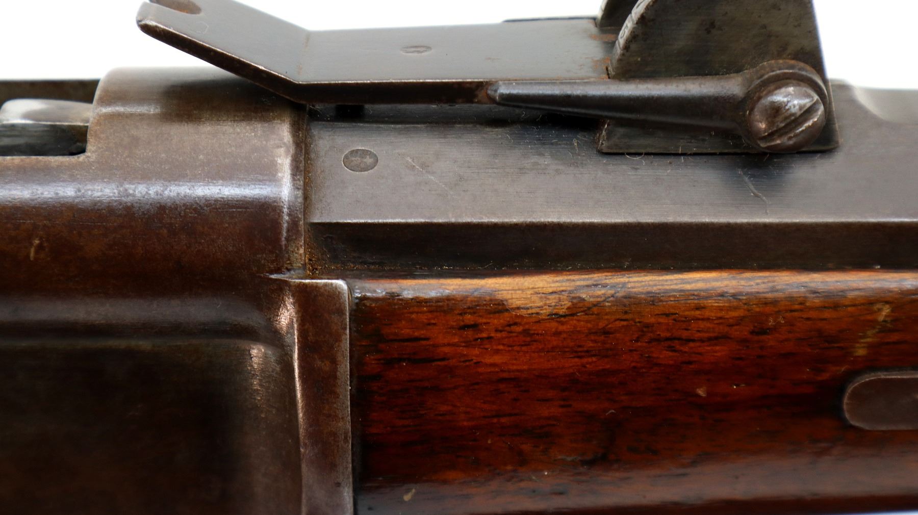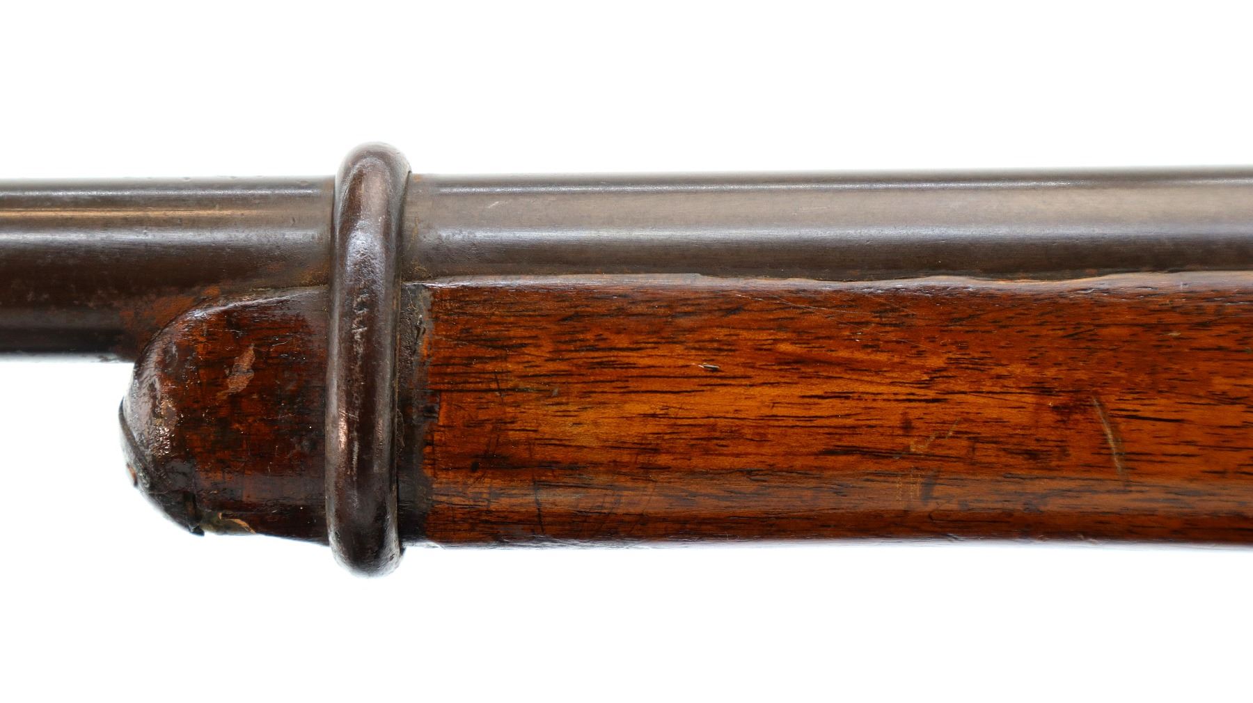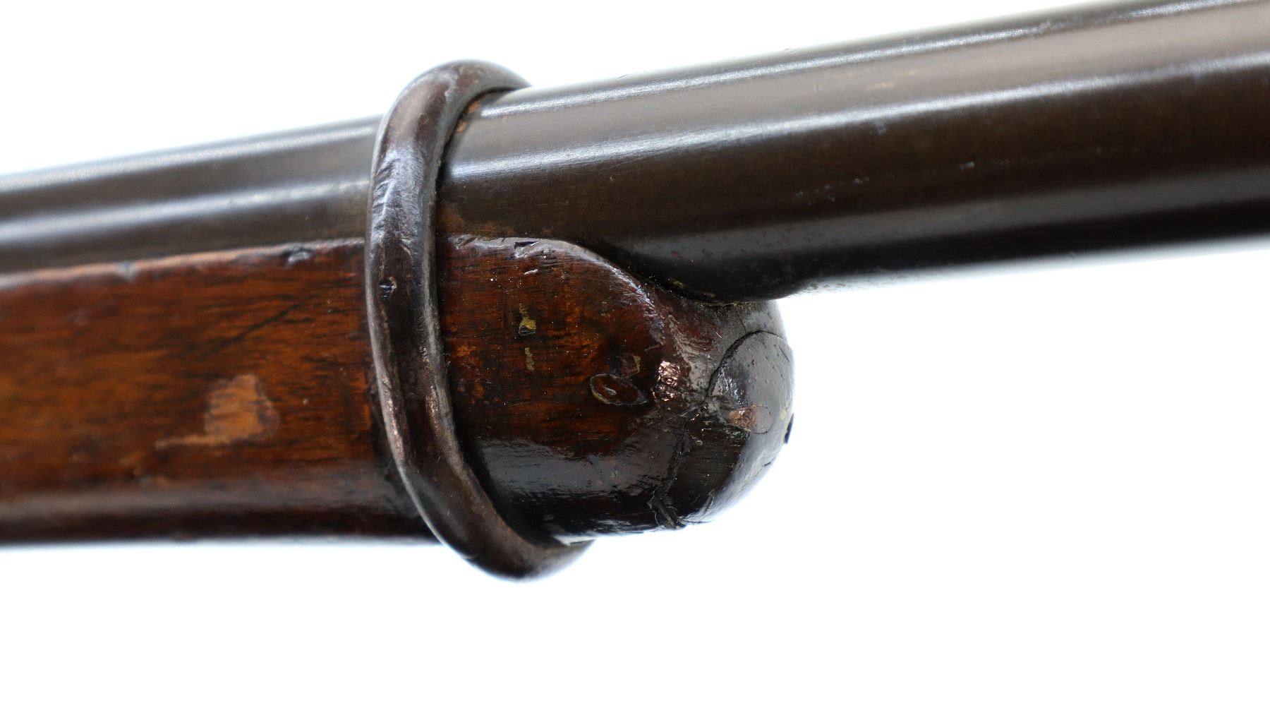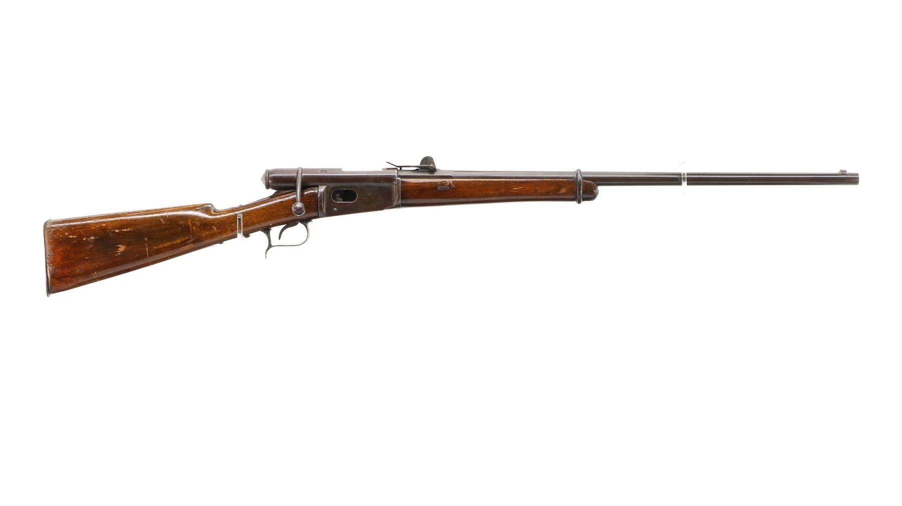 Main Description: Serial numbers mismatched. Broken blade front sight, adjustable u notched rear sight, shortened round barrel, smooth bolt knob, missing elevator and possibly other internal parts. Two piece sporterized wood stocks, forend tip is chipped and cracked, straight grip cracked behind receiver, smooth steel butt plate, finger rest trigger guard.