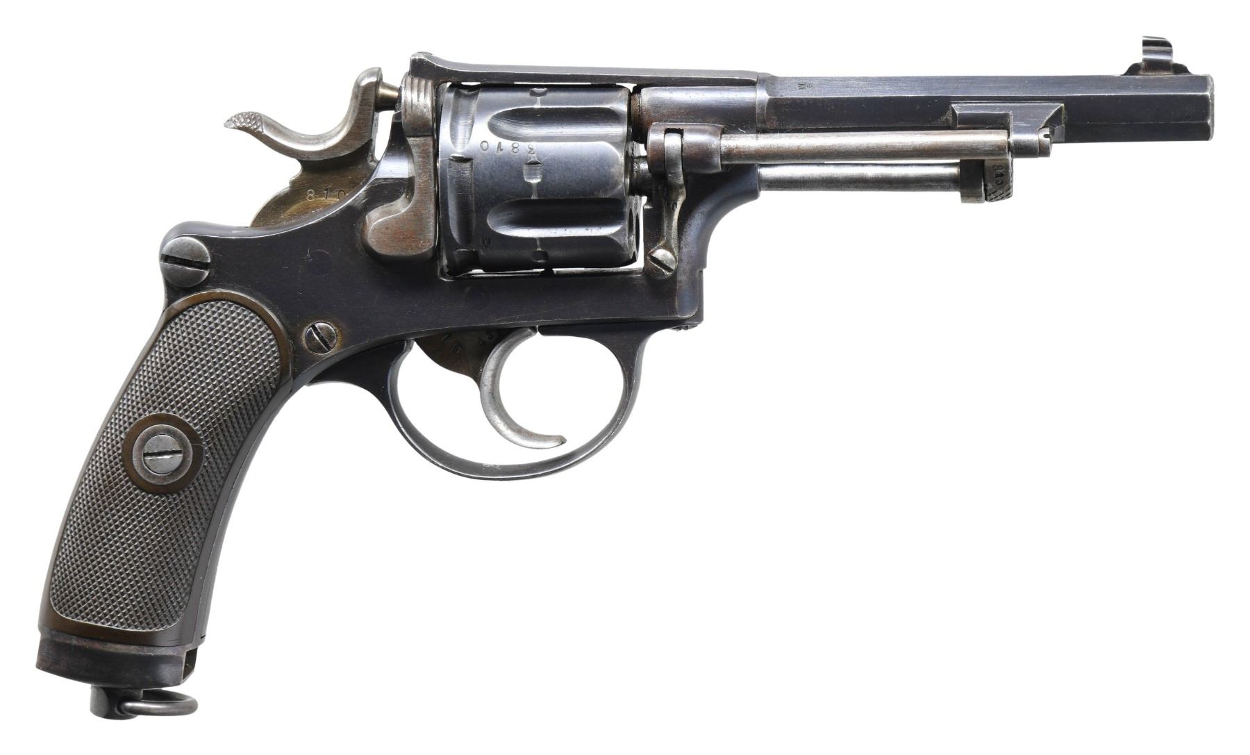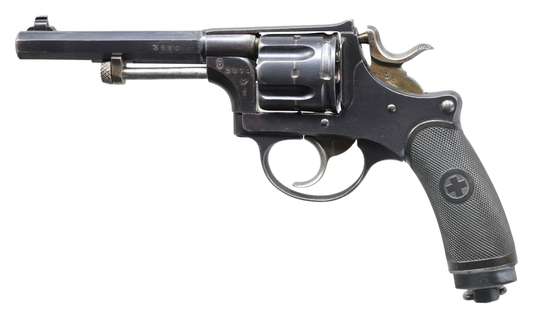 REVOLVER. Cal. 7.5mm Swiss. (7.5x23mmR). S# 3810. Bbl. 4 1/2" octagonal. Model 1882 double action revolver mfg. by Waffenfabrik Bern. Exterior exhibits various Swiss arsenal proofs overall. Metal components exhibit a blue finish overall, save for on the trigger, hammer, ejector rod, and cyl. base pin, which are strawed. Frame is mounted with 2-piece Swiss Geneva cross checkered brown hard rubber grips and features a lanyard swivel and ring on the slotted butt. Dovetailed blade front sight with integral U-notch rear sight. All serialized parts are matching and include the frame, sideplate, trigger, hammer, loading gate, cyl., cyl. base pin, as well as the ejector rod. Grips are matching via a hand inscribed "810" on the interior of the panels. CONDITION: metal components retain the majority of their Swiss arsenal blue finish, showing some light to mild wear and thinning primarily on edges, with light surface oxidation present overall. Strawed parts are fading to gray in contact areas, with spots of age related discoloration overall. Very bright bore, exhibiting some scattered patches of dark mild pitting, while retaining well defined rifling throughout. Grips show light smoothing and some superficial handling marks, but are otherwise sound. (25-4925/MLW). CURIO. $300-500.