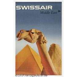 <B>Swissair (1961)</B></I> Travel Poster (25.5" X 39.5"). Stylized camel and pyramid. This is an excellent example from the series of posters Swissair commissioned in the late 1950's through the early 1960's. Giving young designers free rein, they have proved to be a collectible grouping of images. Artist Nikolaus Schwabe. Near Mint condition on Linen.