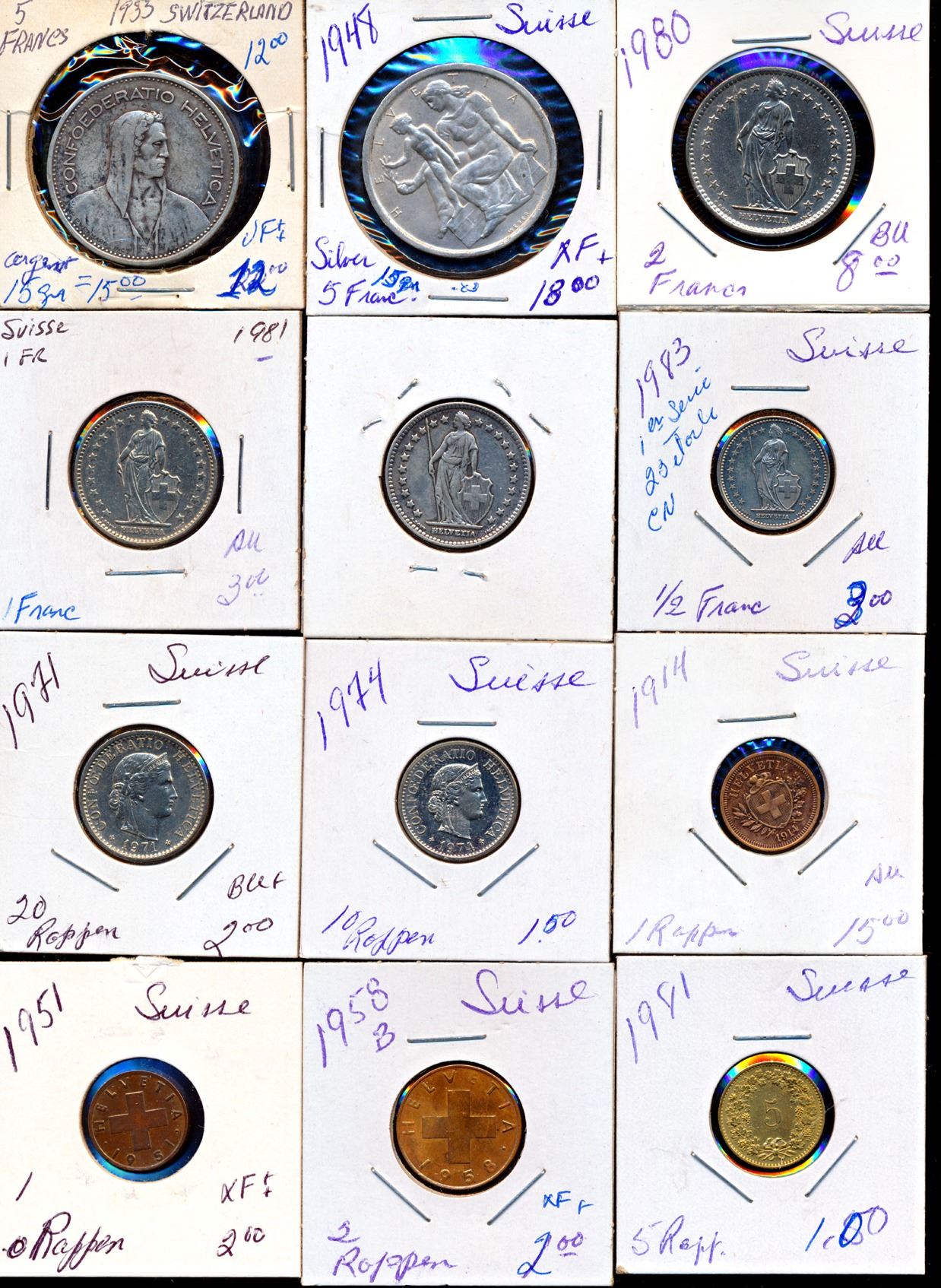 A great starter set for a collector or great inventory for a dealer. The lot has a retail value of $1200.00, covering 1 , 2 ,5 ,10 , 20 Rappen and 1/2 , 1 , 2 , 5 Francs. Most of the coins are higher grades, there is some duplication and none are holed. Great Value!