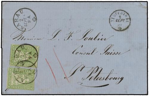 1860 AARAU a ST. PETERSBOURG (Rusia). 40 rp. verde (2). MAGNIFICA. Cert. E. RELLSTAB. (Zu 24G(2)).