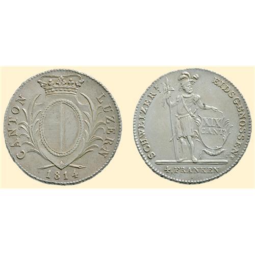 Thaler (4 Francs) 1814. Arms / Soldier with shield. DT 53b, HMZ 641.