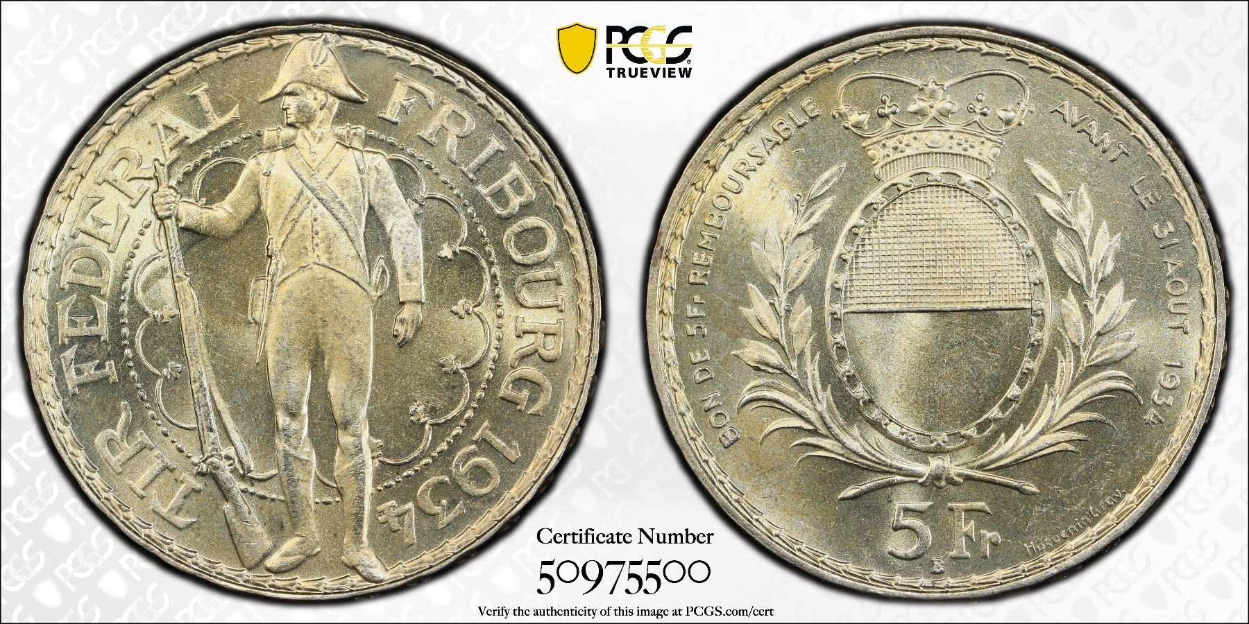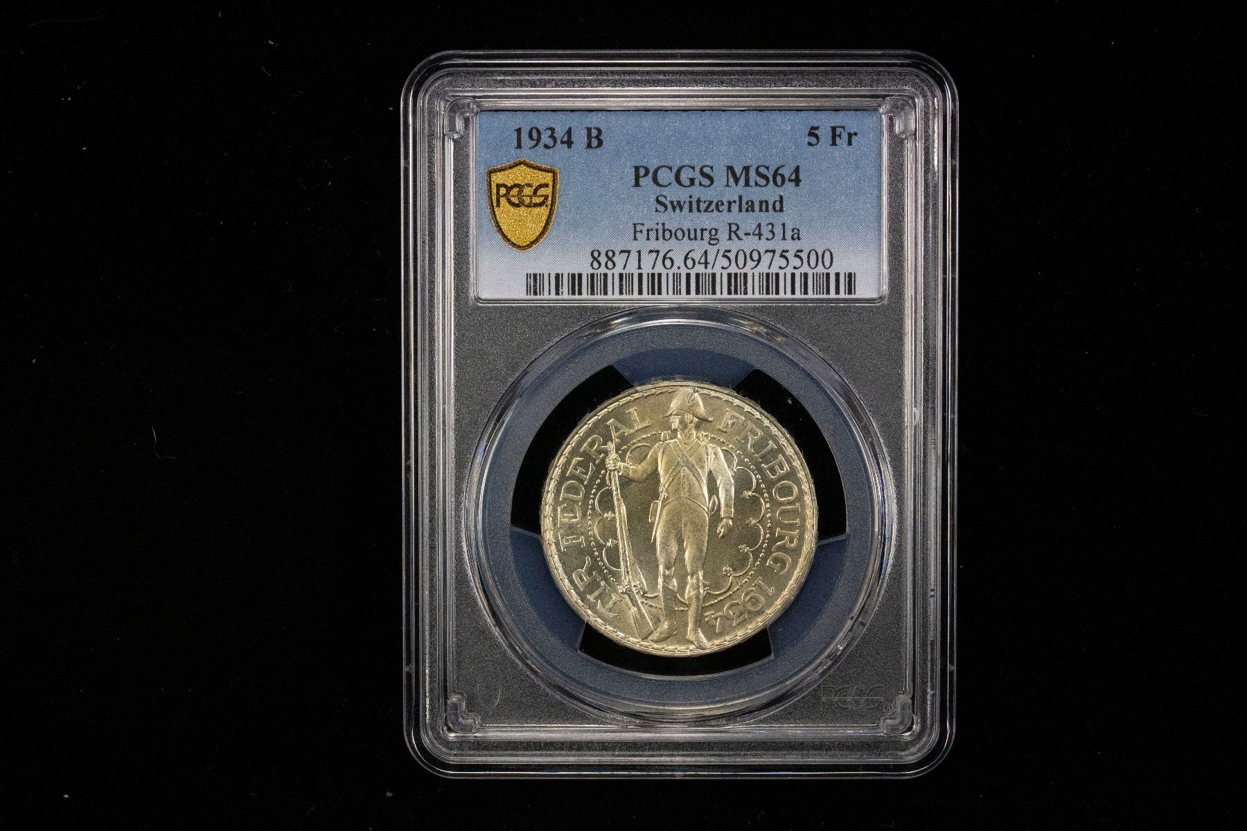 SWITZERLAND: Confederation, AR 5 francs, 1934-B, KM-XS18, R-431a, Fribourg Shooting Festival, a wonderful lustrous example! PCGS graded MS64. The National Shooting Festival is a Swiss federal shooting competition organized by the Schweizerischer Schützenverein (Swiss Shooting Association) since 1824. These festivals are held every five years in a different region of Switzerland. Fribourg has hosted this event multiple times, including in 1934.