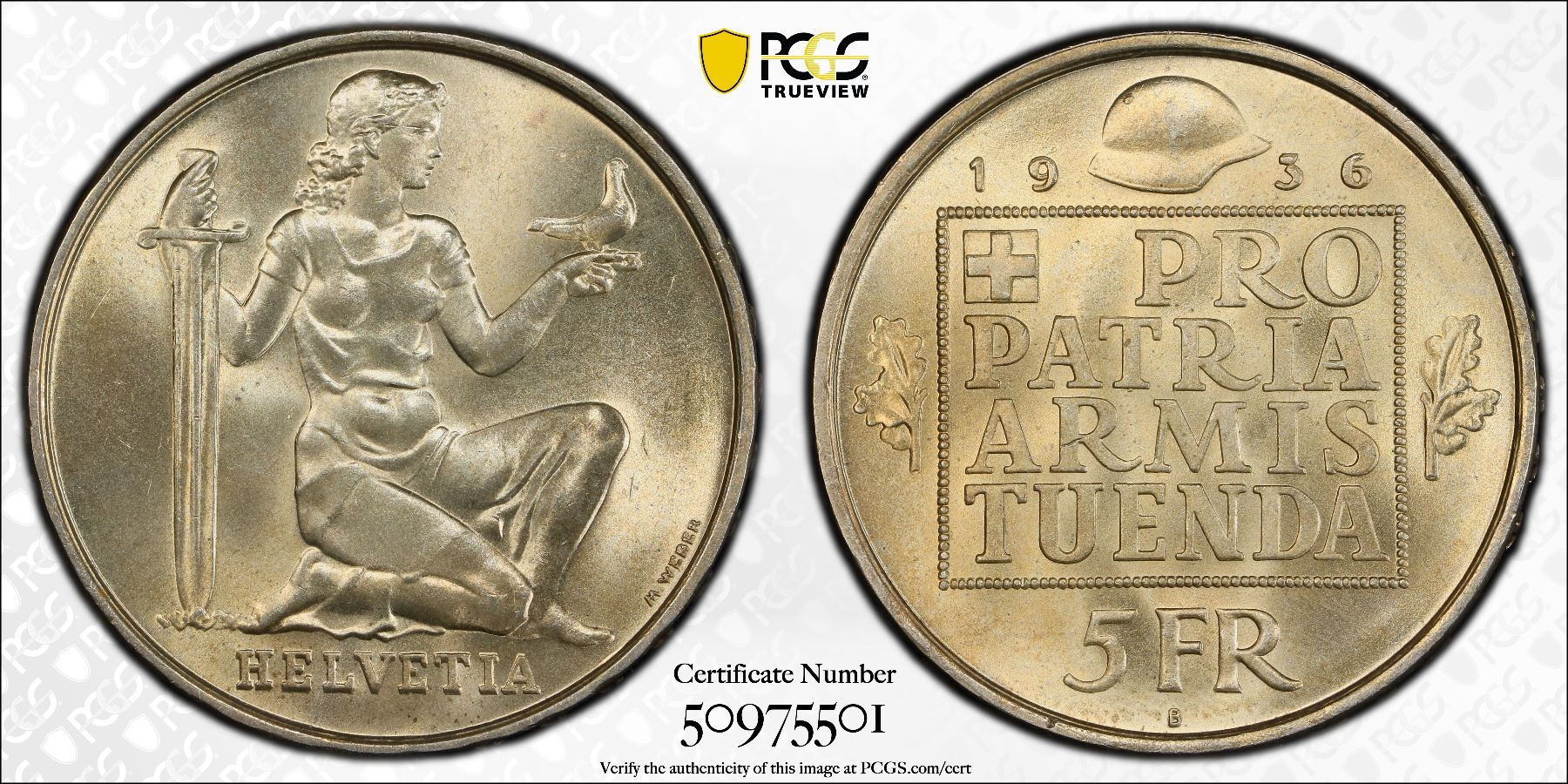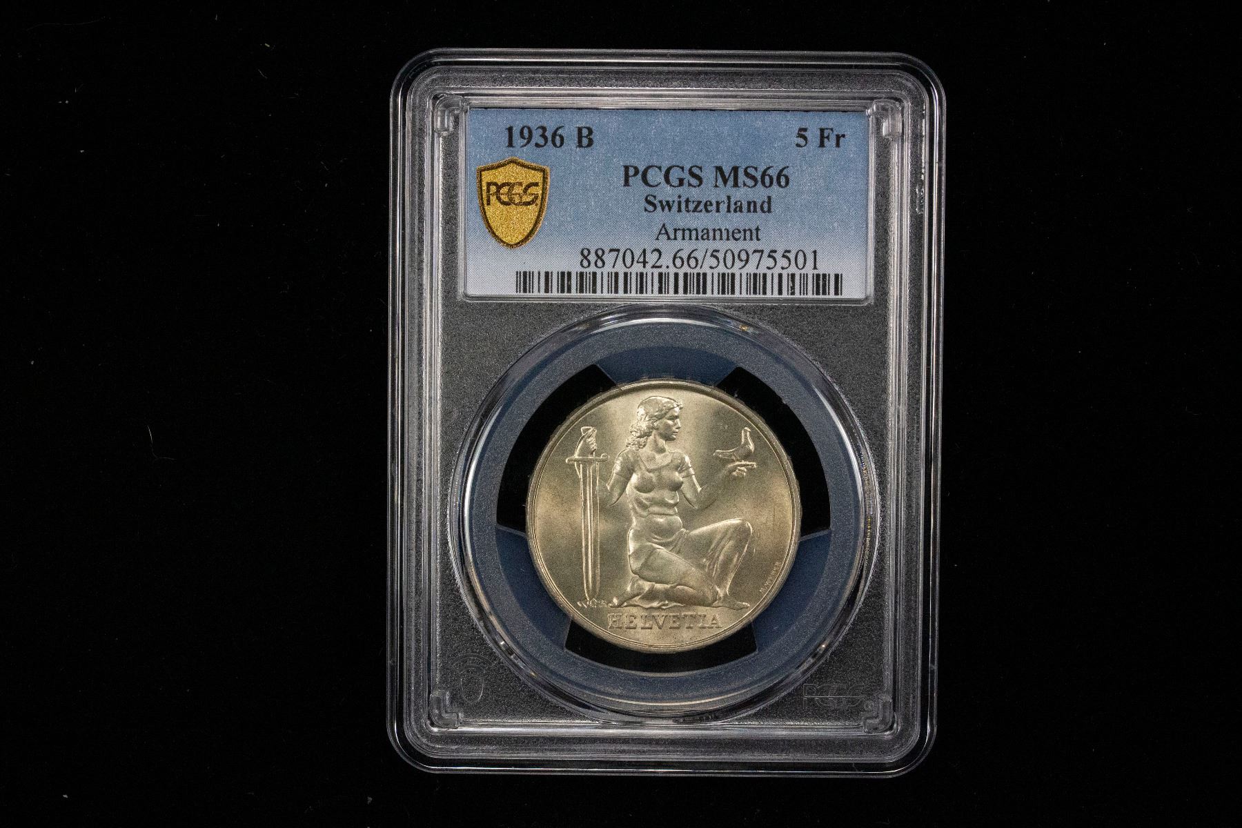 SWITZERLAND: Confederation, AR 5 francs, 1936-B, KM-41, War Bond "Wehranleihe" Commemorative, a fantastic quality example! PCGS graded MS66. This is the first commemorative coin issued by Switzerland. It celebrates the War Bond ("Wehranleihe") issued in 1936 by the government to raise money to strengthen the Swiss military, as it was already evident that a second world war was inevitable. The design of the coin symbolizes a peaceful country that is ready for war.