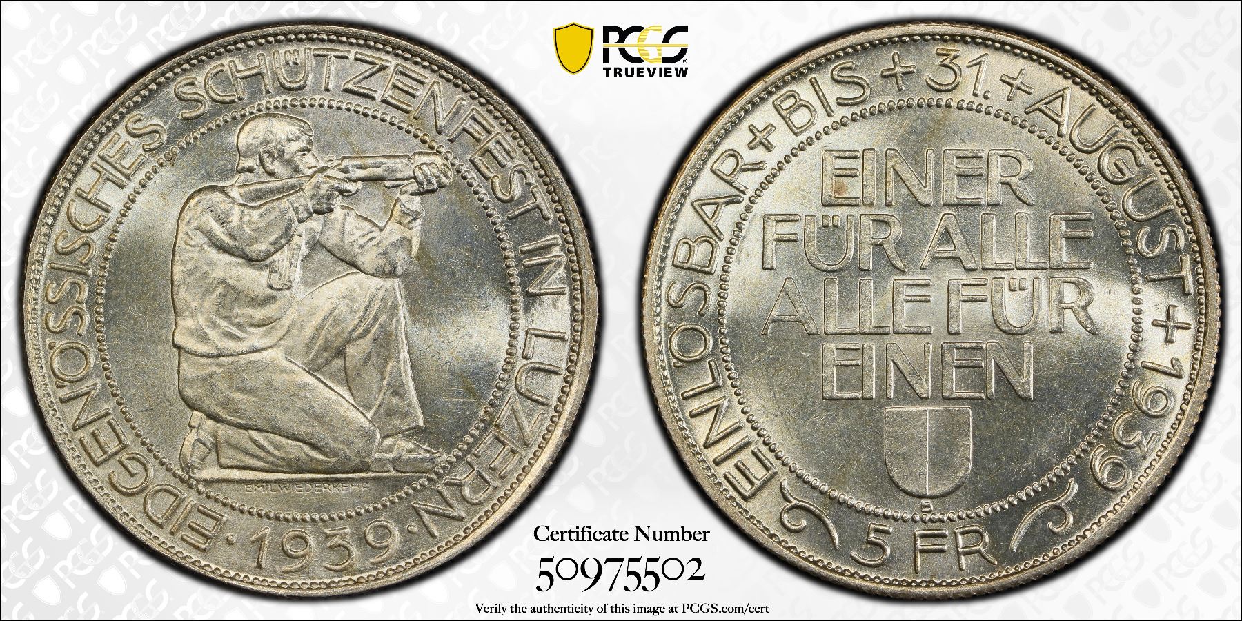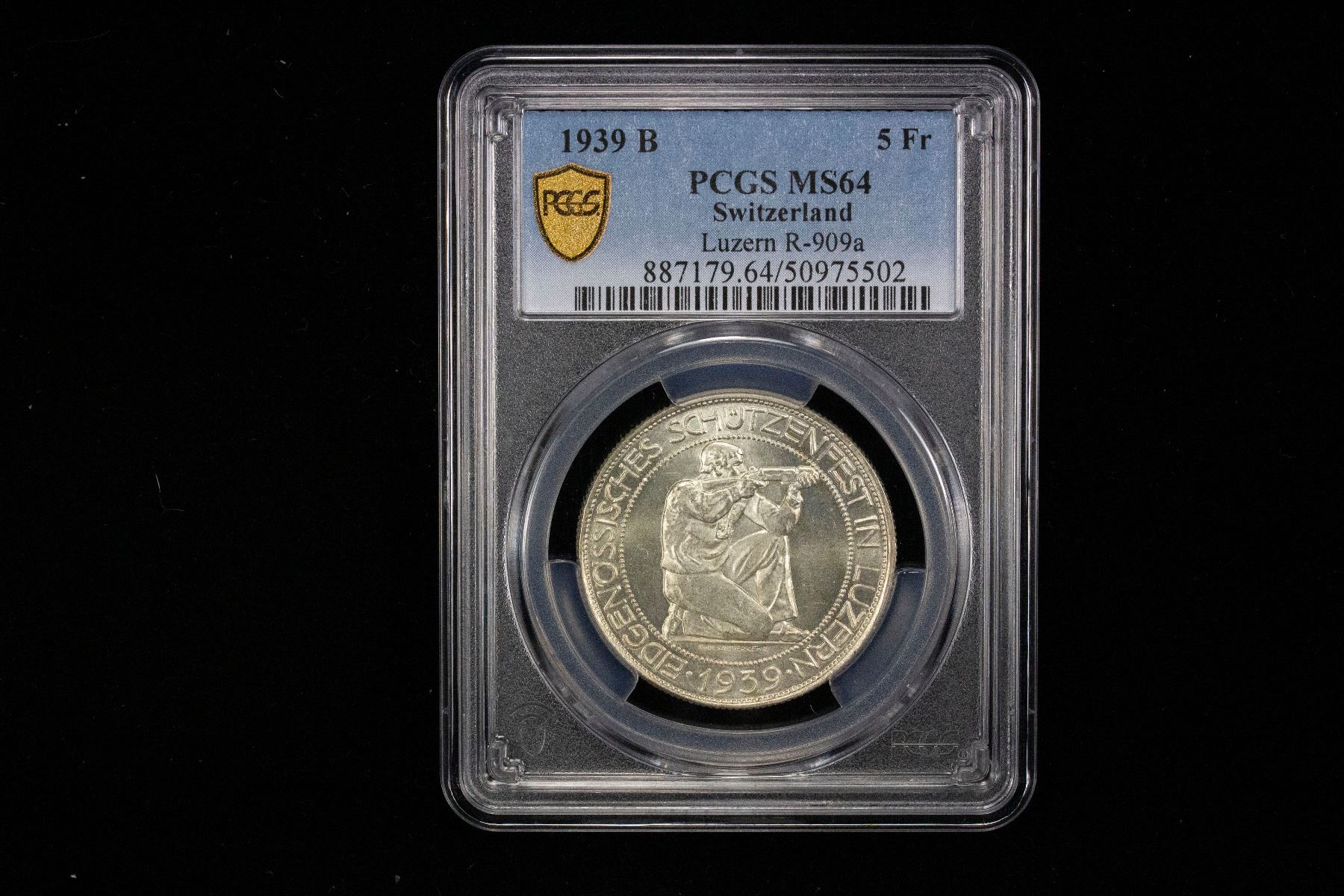 SWITZERLAND: Confederation, AR 5 francs, 1939-B, KM-XS20, Luzern (Lucerne) Shooting Festival, a wonderful quality example! PCGS graded MS64. The National Shooting Festival is a Swiss federal shooting competition organized by the Schweizerischer Schützenverein (Swiss Shooting Association) since 1824. These festivals are held every five years in a different region of Switzerland. Luzern has hosted this event multiple times, including in 1939.