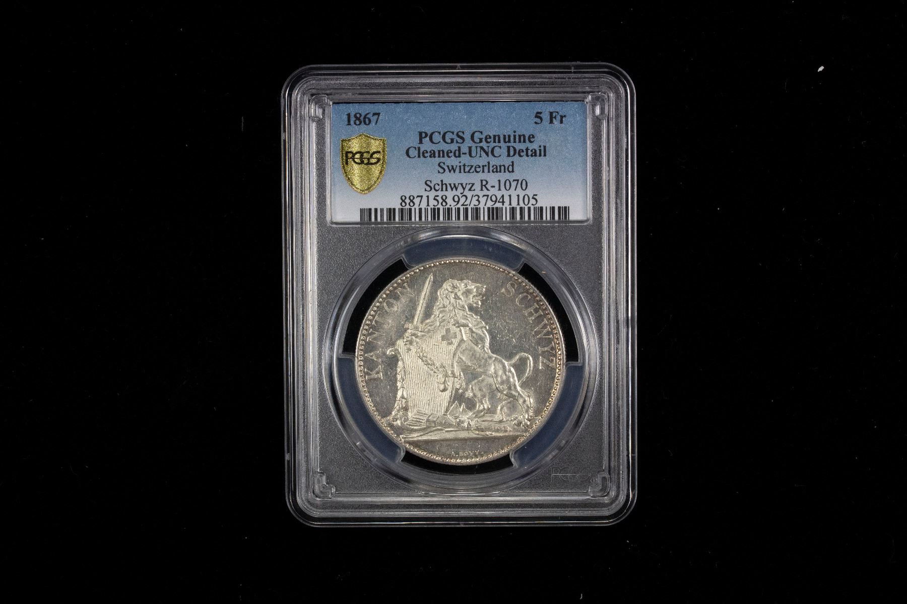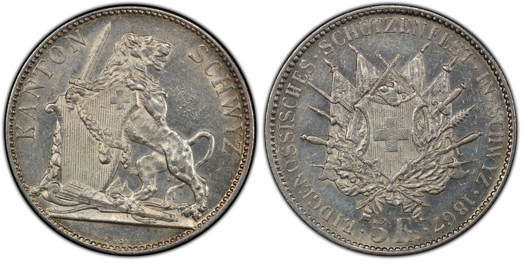 SWITZERLAND: Confederation, AR 5 francs, Bern, 1867, Bruce-XS9, Richter-1070, Schwyz Shooting Festival, mintage of only 8,000 pieces, PCGS graded UNC details, ex Heritage Auction 231937, Lot 62444.