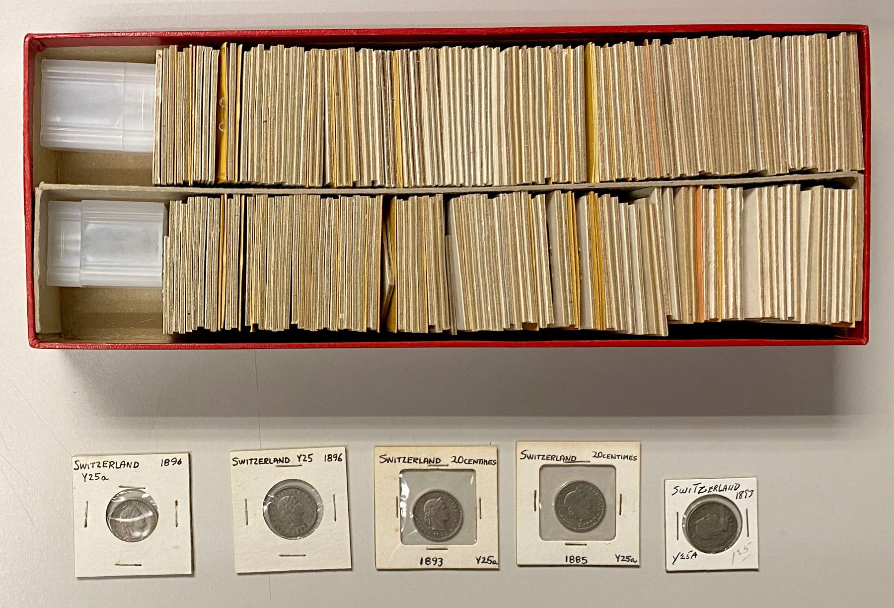 SWITZERLAND: Confederation, LOT of 245 coins, coins from the 1870s onward, with many silver coins, with date runs from an old collection; retail value $900, lot of 245 pieces, ex Almer H. Orr III Collection.