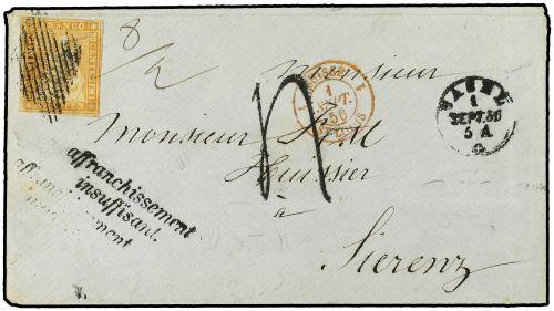 1856 (Sept 1) Cover from Basel franked solely by 1854 20r. Orange tied by rauten in black, two strikes of italic ´Affranchisement/Insuffisant´ below. St. Louis entry mark in red and charged due. Sierentz cds (just across the border) on reverse (Sept 1).An unusual cover. Scott 23.