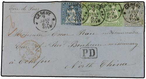 1862 GENEVE a CHEFOU (China). 10 rp. azul, 40 rp. verde (2) y 1 Fr. gris. Manuscrito "Care of Revd. Bonhoure missionary a Tchéfou". Al dorso, fechadores de tránsito de HONG KONG y MARSELLA. Excepcional destinación. Cert. U. HERMANN. (Zu. 23G, 27D(2), 26G).
