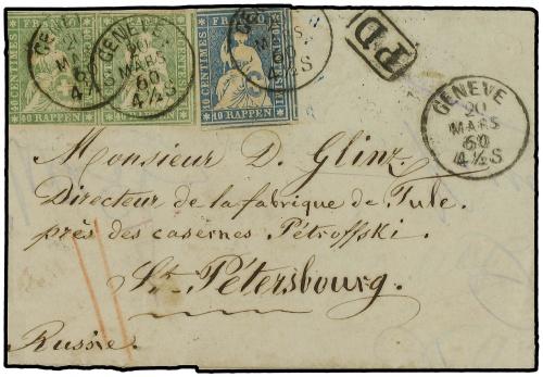 1860 GINEBRA a ST. PETERSBOURG (Rusia). 10 rp. azul y 40 rp. verde (2). MAGNIFICA. Cert. SCHAFER. (Zu. 23G, 26C).