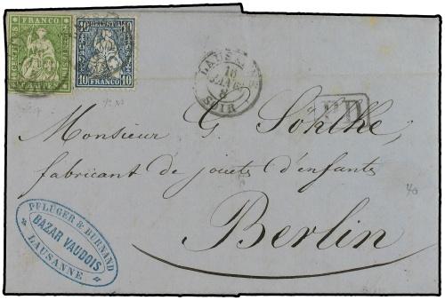 1863 LAUSANNE a BERLIN. 10 rp. azul y 40 rp. verde. Excepcional franqueo mixto dentado y sin dentar, doblez horizontal que afecta a los sellos. Muy raro franqueo. (Zu. 26G,31).