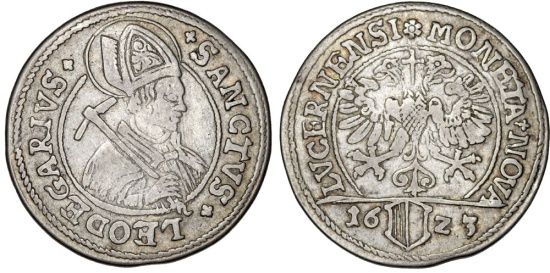 Obv: Half-length bust of St. Leodegarius right, holding pastoral; to right.