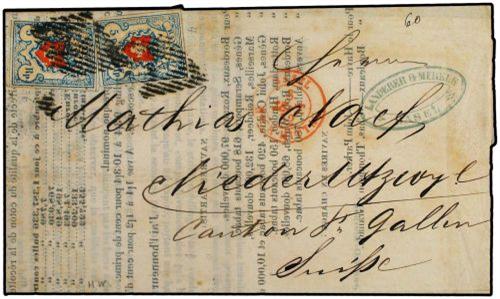 1852 Prices Current from NEW ORLEANS sent as Consignees mail and onwards with LANDERER & MERKLE-BASEL green Forwarding Agents cachet at right, used to ST GALLEN franked by two unframed Rayon I 1851 5 rp. pale blue and red tied by black lozenge with red BASEL cds alongside. Rare cover. Sc 9.