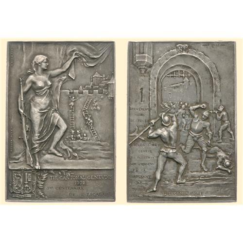 Silver plaque 1902 (60 x 40mm, 59.85 g) by Hugues Bovy on the Cantonal Shooting Match and the 300 Years Anniversary of the Escalade, the last attempt of the Duke of Savoy to conquer Geneva. Female figure with gun pulling a curtain to reveal Savoyards climbing the town wall / Soldiers fighting at the city gate. Richter 720.