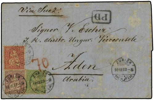 1873 ZURICH a ADEN (Arabia). 10 rp. rojo, 25 rp. verde y 50 rp. lila. Circulada via Brindisi y Suez. Al dorso fechador de llegada. Excepcional destinación. Cert. P. GUINAND (Zu. 38c, 40d, 43b).