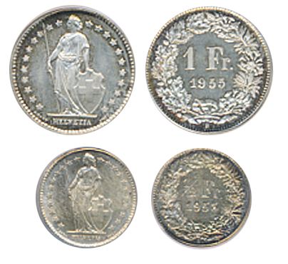 1 Franc. 1955-B. KM#24. PCGS graded Specimen-66; 1/2 Franc. 1953-B. PCGS graded Mint State-64. Lot of two (2) pcs.