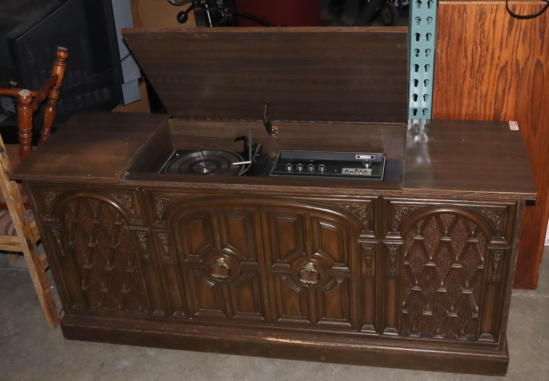 RECORD, AM/FM, 8 TRACK. APPROX 60" X 18" DEEP X 28" TALL. ON WHEELS. SOME DAMAGE TO TOP, LID NOT CLOSING RIGHT AS WELL. WORKING.