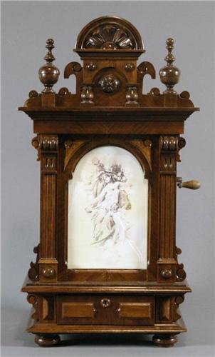 SYMPHONIAN "MUSIK AUTOMAT" UPRIGHT DISK MUSIC BOX 11 3/4" disks 32 1/2" hgih overall circa 1895, excellent, but we can not guarantee any mechanical antiques to be working after shipping.