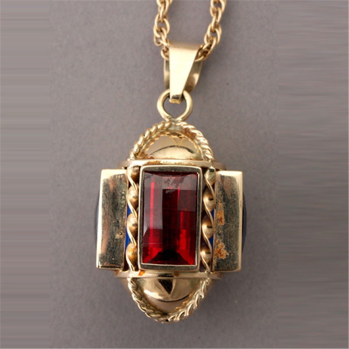 SYNTHETIC SAPPHIRE, 14K YELLOW GOLD PENDANT-NECKLACE. Featuring four faceted topped rectangular synthetic sapphires bezel set in a 14k yellow gold pendant suspended from a 14k yellow gold 30 inch chain. 24.7 dwts