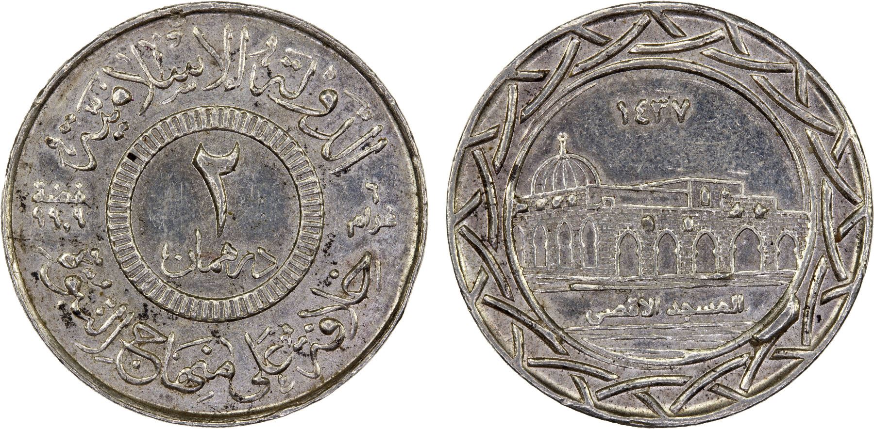 SYRIA: Islamic State, AR 2 dirhams, AH1437, denomination in center, al-dawlah al-islâmiyyah / khilâfatun 'alâ minhâji al-nabuwwah ("Islamic State / a caliphate upon the model of the Prophethood") in the margin, and "6 grams / 99.9 silver" across field // al-masjid al-aqsâ ("al-Aqsa Mosque") and view of the mosque, date above, all within ornamental border, lustrous, Choice Unc. The Islamic State gold dinar was the de-jure currency of the Islamic State from 2014 to 2019. It is also subdivided into silver dirhams and copper fulus, and it has its origins in the historical gold dinar. In 2016 (AH1438), one gold dinar was exchanged for 190 U.S. dollars or 91 British pounds. A series of coins divided between gold 5, 2, and 1 dinars, silver 5, 2, and 1 dirhams and copper 25, 10 and 5 fulus were released as such. Despite the extensive promotion of the Islamic State in this coinage series, the currency only saw limited circulation in areas under their control.