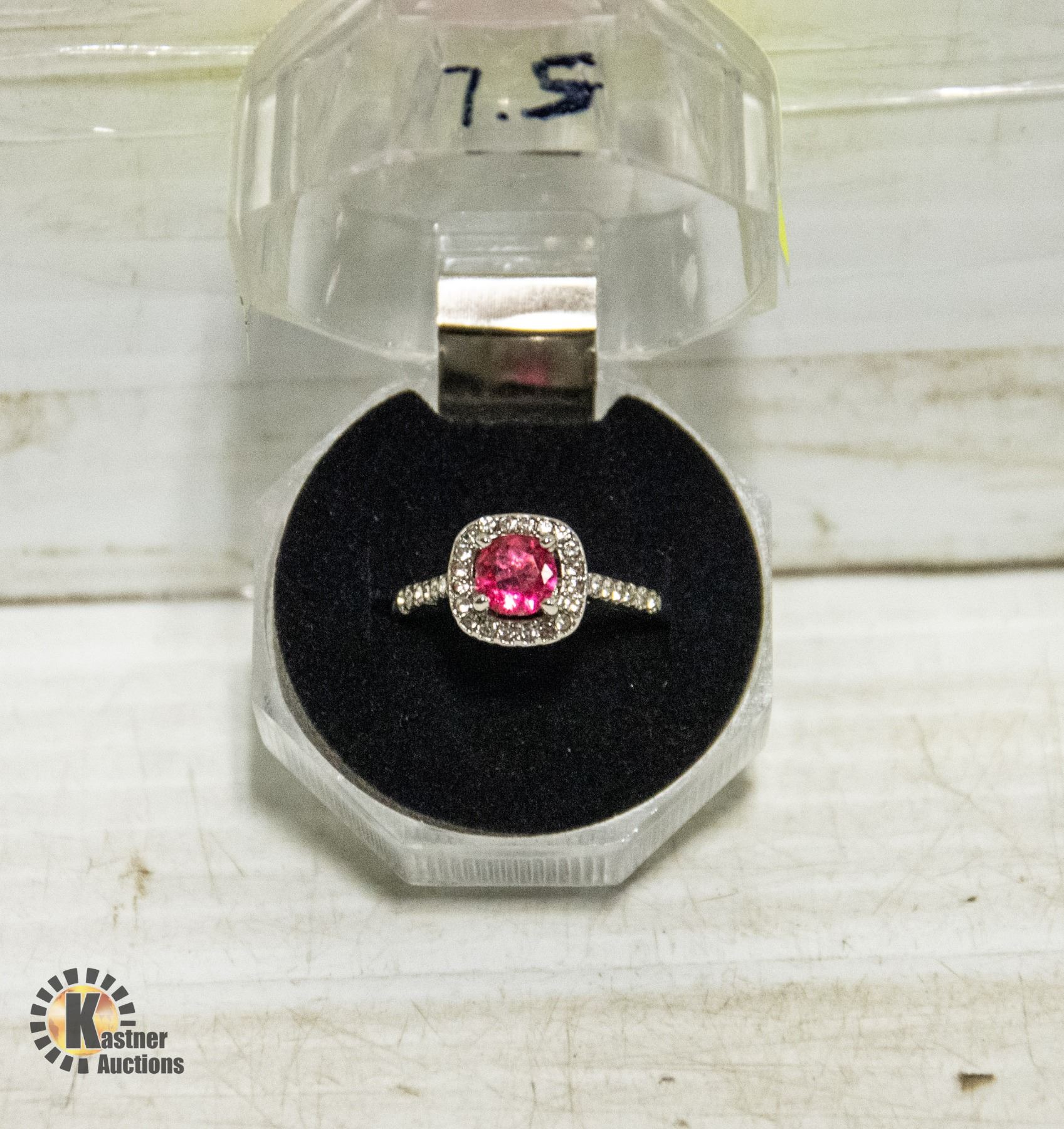 SZ 7.5 PINK STONE CLEAR HALO GOLD PLATED RING