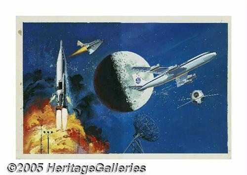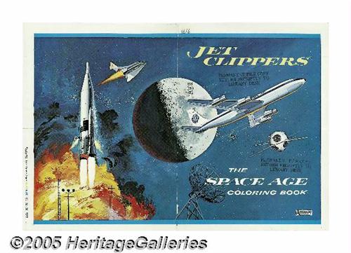 <B>Saalfield Staff Artist - Jet Clippers Coloring Book Cover Original Art (Saalfield, 1963).</B></I> The space race was in full swing when this coloring book was published, as Americans grew fascinated with aircraft of all types. This stunning painting features an array of flying machines, all gorgeously rendered in razor-sharp detail. The image area measures 22" x 14" and the art is in Excellent condition. Also included is a color proof sheet of the printed cover.