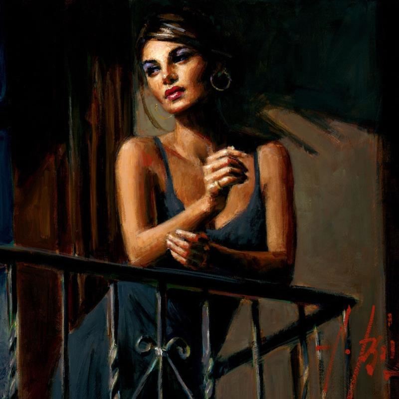 "Saba at the Balcony VII Black Dress" is a hand embellished limited edition giclee on stretched canvas by Fabian Perez. The piece is numbered and hand signed by the artist and comes with a Certificate of Authenticity. Measures approx. 14" x 18" (image). Please allow 5 additional business for items that include canvas stretch or framing.