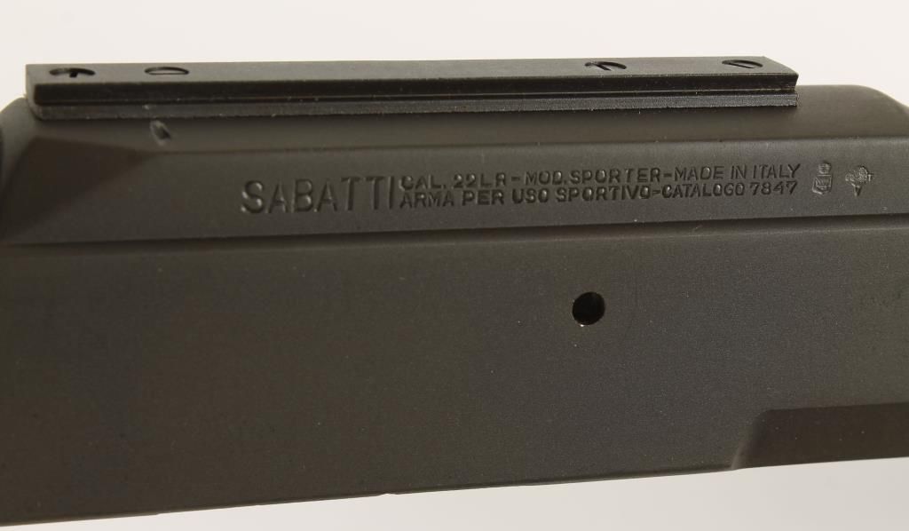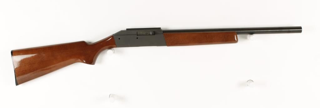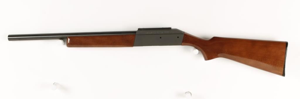 Italian made semi auto rimfire rifle with 18" bull barrel. Matte blue finish on receiver, plain semi pistol grip wood stock and forend, no sights, and fitted with scope rail. Good bore, missing entire trigger assembly. Condition: Good with barrel having pinpricking and trigger assembly missing. *MODERN FIREARM*