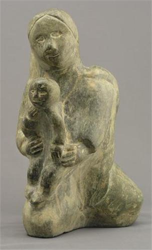[Hall Beach NWT 20th century] MOTHER & CHILDREN Grey-grey stone carving 12 ins. high -Signed