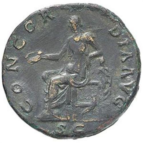 Impero Romano. Sabina, moglie di Adriano (deceduta nel 137 d.C). Sesterzio. D/ SABINA AVGVSTA HADRIANI AVG PP. Busto diademato e drappeggiato a destra. R/ CONCORDIA AVG SC. La Concordia, seduta a sinistra, tiene patera e appoggia il gomito sinistro su statua della Spes. Sotto la sedia, una cornucopia. RIC 1025. gr. 24.44 R. AE. BB.