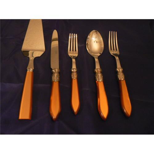 Beautiful French Sabre eating utensils in a wonderful bakelite Caramel color. These are very fashionable as they are rich in color and just a delight to see. Kind of makes one hungry just looking at them. Included in the set is a pie server that is just wonderful, it is also in mint condition. They are all in mint condition. Sorry I do not know the age...they were packed away for a period of time. Kept very well as you can see. Real good buy to complete a set.