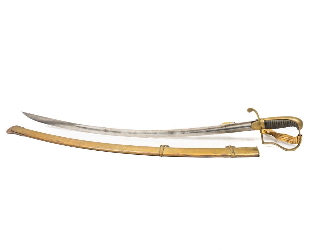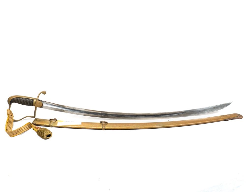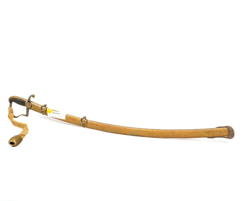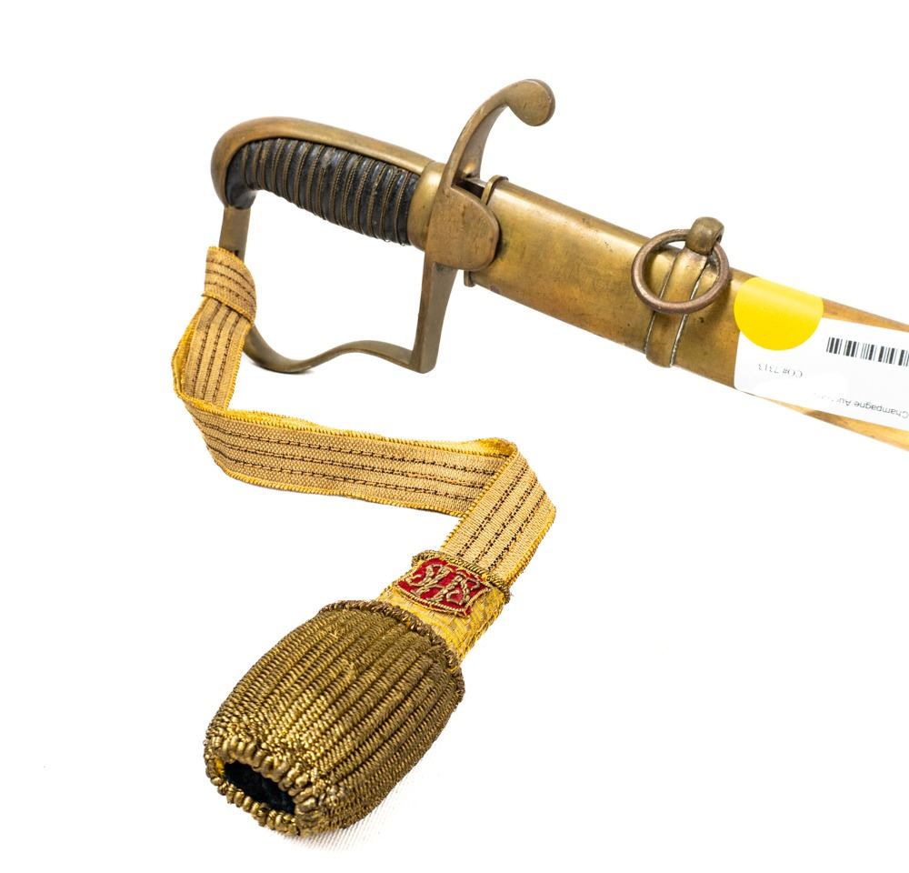 Sans marque. Garde et fourreau en laiton. PoignEe en bois ceinturEe de fils de mEtal. Dragonne en fils dorEs avec monogramme