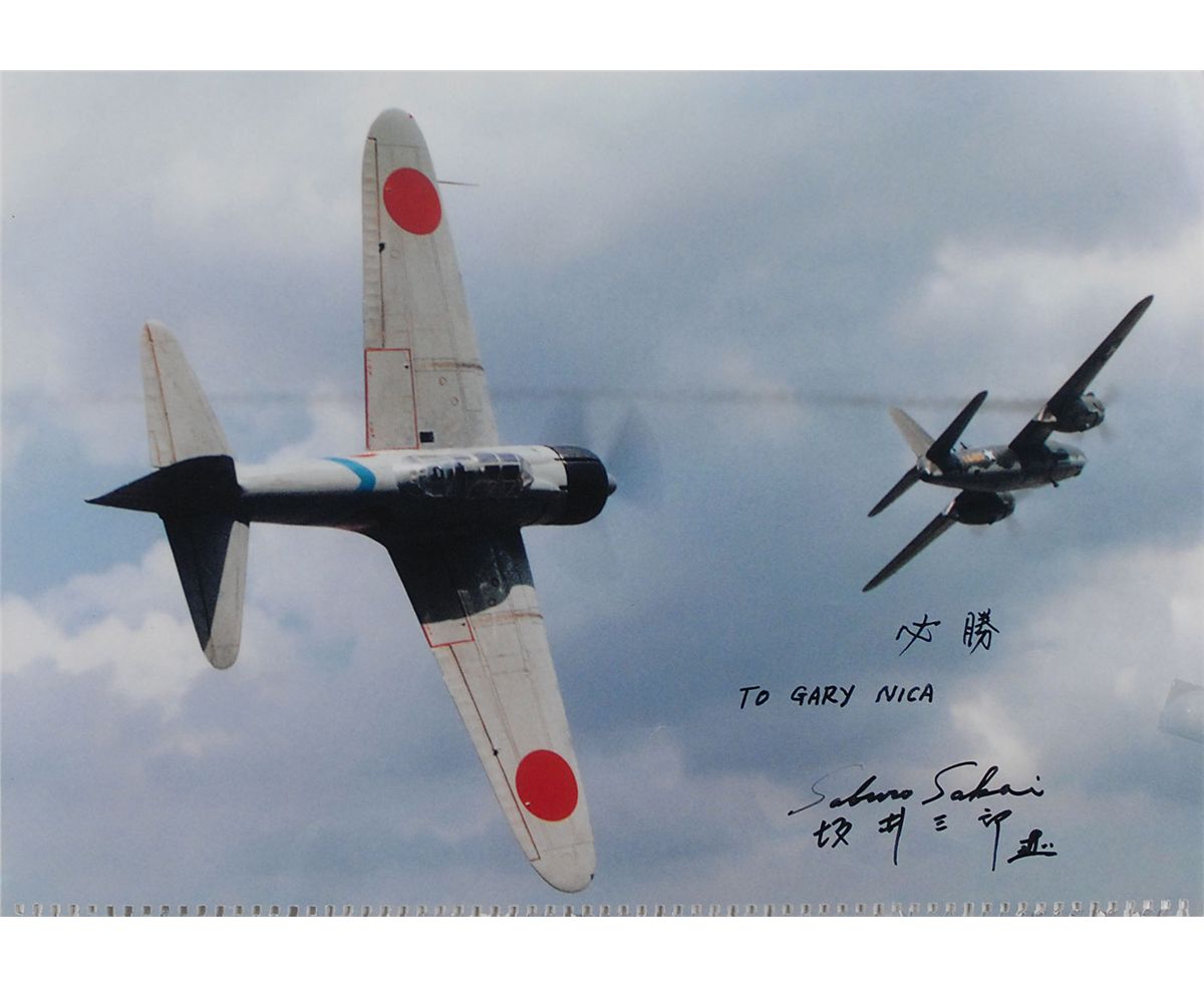 Color 16.5 x 11.75 photo of a Japanese plane removed from a calendar, signed and inscribed in English and Japanese in black felt tip, “To Gary Nica, Saburo Sakai.” A small area of tape remnants to the right border and a rough lower edge from removal from the spiral-bound calendar, otherwise fine condition.