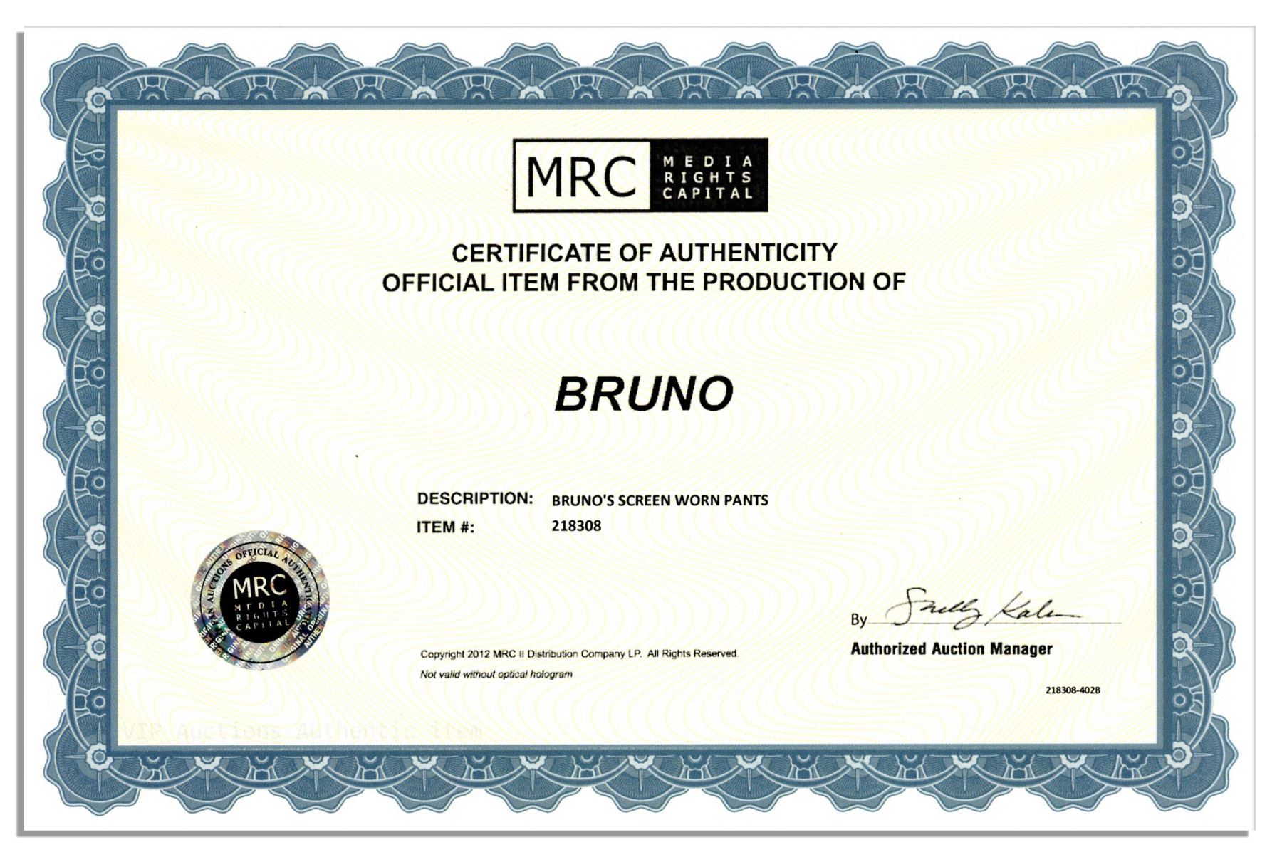Sacha Baron Cohen screen-worn pants from ''Bruno''. Cohen starred to hilarity in the 2009 satire as the eponymous character, a gay fashionista from Austria. Black pants by Merona are size 36 x 32 and made of a polyester and rayon blend. Near fine. With COA from Media Rights Capital, the film's producer.