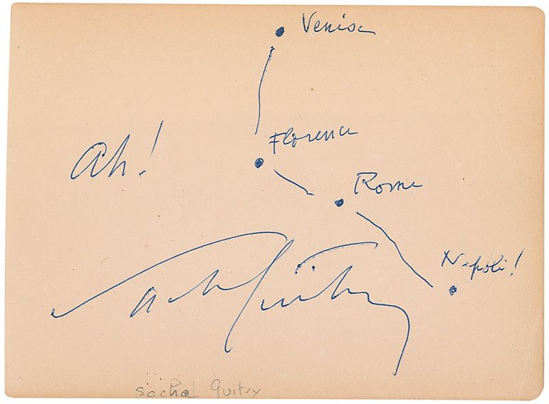French actor, director, and screenwriter (1885–1957) who was controversially arrested after WWII for accepting special favors from the Nazi occupiers. Vintage ink signature, “Ah! Sacha Guitry,” on an off-white 6.5 x 4.5 album page with a small pencil notation along the bottom, adding a sketch of a map of Italy above his signature. In fine condition, with a crease to lower right corner.