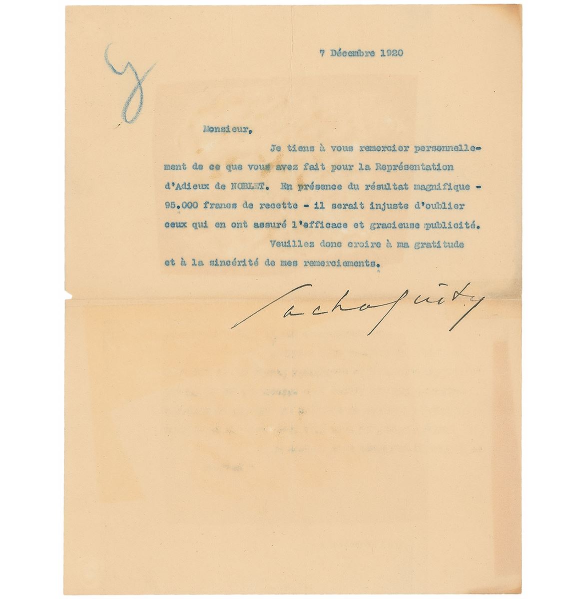 French actor, director, and screenwriter (1885–1957) who was controversially arrested after WWII for accepting special favors from the Nazi occupiers. TLS in French, one page, 8.25 x 10.5, December 7, 1920. In part (translated): “I would like to thank you personally for what you did for the Representation of Farewell Noblet…it would be unfair to forget those who have ensured the efficient and graceful advertising.” In very good condition, with central vertical and horizontal folds passing through the signature, tape-repaired partial edge separations with some show-through behind the signature, and irregular toning. Guitry had organized a play to honor Georges Noblet, a comedy in two acts that featured the great Sarah Bernhardt, Yvonne Printemps, Lucien and Sacha Guitry, and Noblet himself.