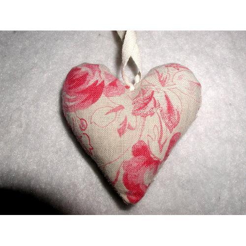 From England,lovely little heart shaped sachet made from C.19th century linen textile fabric in deep rose and cream background. Filled with English lavender and hung with a cream satin ribbon. The strong fragrance is sure to make any closet,drawer or room smell especially nice as well as being a decorative accent. Excellent condition. Measures 6H (with ribbon) X 2.5L X .75D.