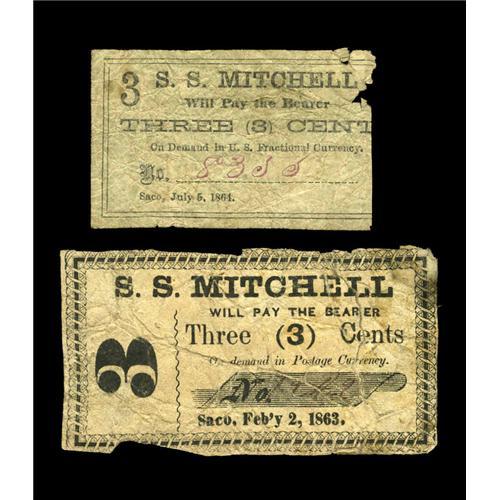 <B>Saco, ME- S.S. Mitchell</B></I> 3¢ (2) Feb. 2, 1863, July 4, 1864 Wait 16, UNL<BR>Two pieces, the first payable in "Postage Currency," the second, dated in 1864, payable in "Fractional Currency," a very rare occurrence. The first is a damaged and backed <B>Very Good,</B></I> the second grades <B>Fine</B></I> with some nicks out of the top right corner.