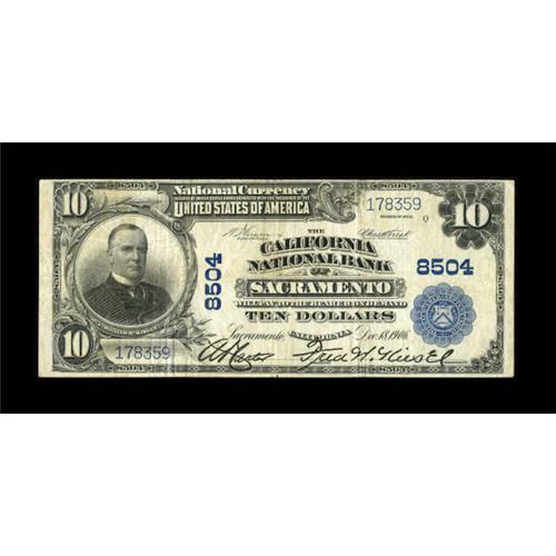 <B>Sacramento, CA</B></I> - $10 1902 Plain Back Fr. 626 <B>The California NB</B></I> Ch. # 8504<BR> The stamped signatures are quite dark on this pleasing lightly circulated capital city note. <B>Fine-Very Fine</B></I>.<BR><I>From The Kansas City Collection.</B></I><BR><BR><b>Shipping:</b> Coins & Currency (<a target="_blank" href="http://www.heritageauctions.com/common/shipping.php">view shipping information</a>)