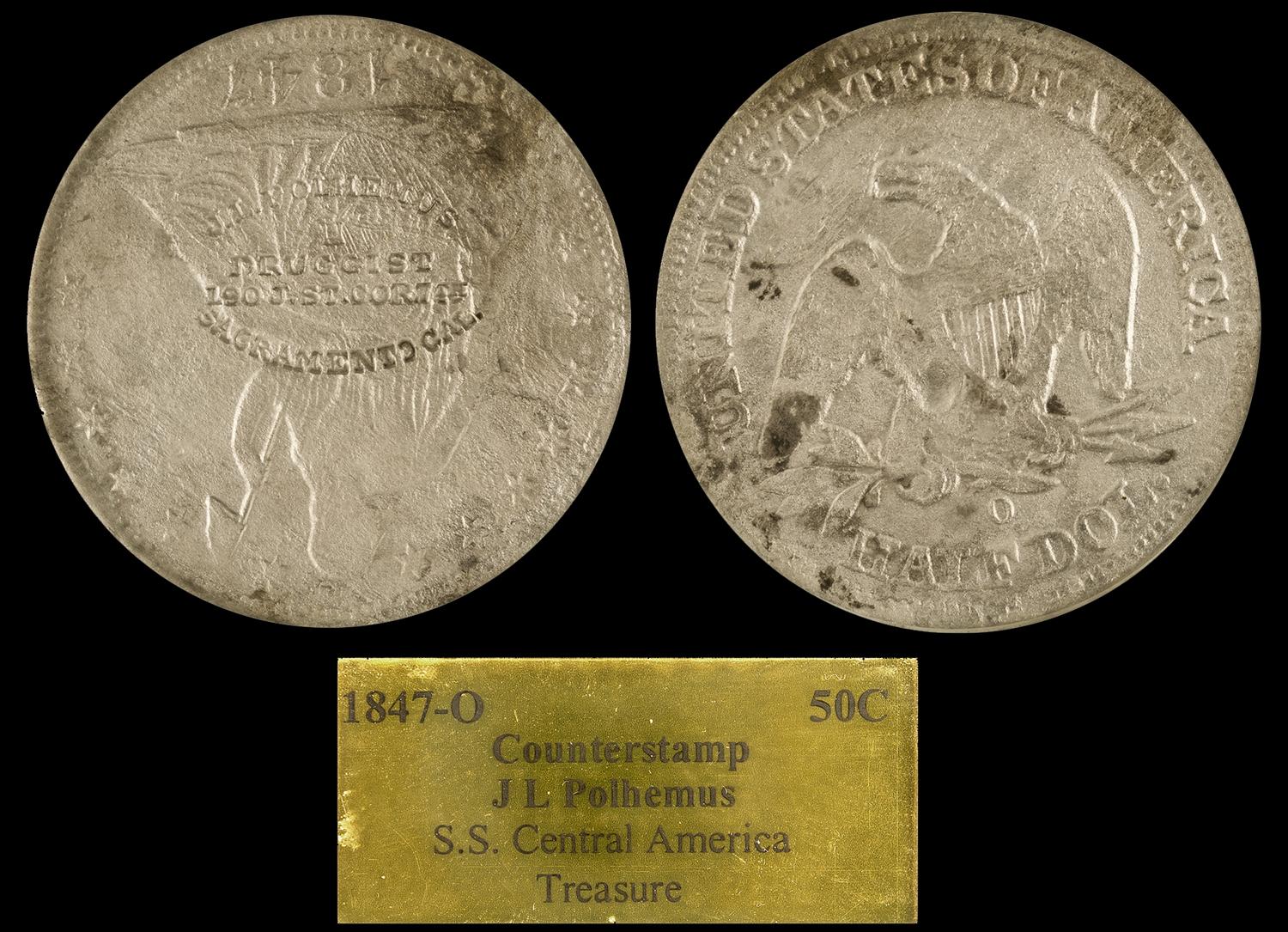 1847-O seated 50c piece. PCGS certified from the wreck of the SS Central America. Pale, silver, grey with even moderate corrosion that allows most of the details to remain bold. This half dollar and an 1855-S $20 are the only Polhemus counter marks found aboard the Ship of Gold. Only one other counter mark appeared among the SS Central America treasure, a gold piece marked by dentist and assayer W.W. Light. J.L. Polhemus was the most famous Sacramento gold rush counter stamp.