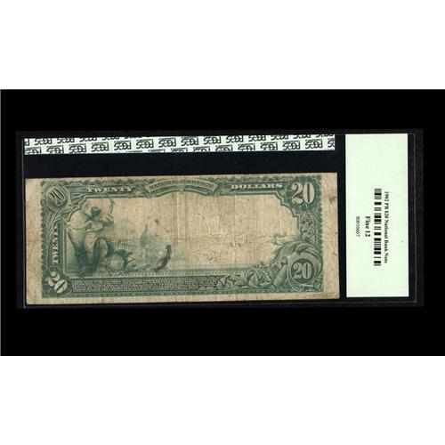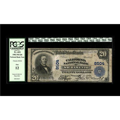 <B>Sacramento, CA</B></I> - $20 1902 Plain Back Fr. 652 <B>The California NB</B></I> Ch. # 8504<BR>This was the only federally chartered bank in the California state capital to fail during the depression. <B>PCGS Fine 12,</B></I> with darkly stamped signatures readily apparent.