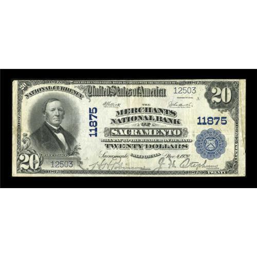 <B>Sacramento, CA</B></I> - $20 1902 Plain Back Fr. 659 <B>The Merchants NB</B></I> Ch. # 11875<BR> A pleasing mid-grade issue with solid paper and bold printed signatures. <B>Very Fine.</B></I><BR><I>From The Kansas City Collection.</B></I><BR><BR><b>Shipping:</b> Coins & Currency (<a target="_blank" href="http://www.heritageauctions.com/common/shipping.php">view shipping information</a>)