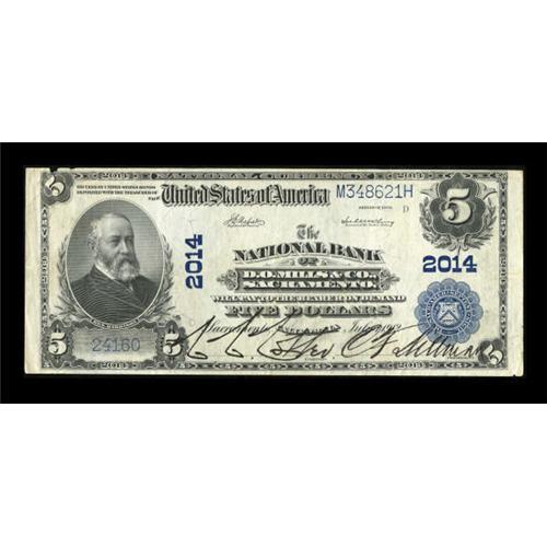 <B>Sacramento, CA</B></I> - $5 1902 Plain Back Fr. 602 <B>The NB of D O Mills & Co.</B></I> Ch. # 2014<BR> A small bit of the upper left corner has been lost. Otherwise the signatures and paper are very bright. <B>Fine-Very Fine</B></I>.<B></B></I><BR><I>From The Kansas City Collection.</B></I><BR><BR><b>Shipping:</b> Coins & Currency (<a target="_blank" href="http://www.heritageauctions.com/common/shipping.php">view shipping information</a>)