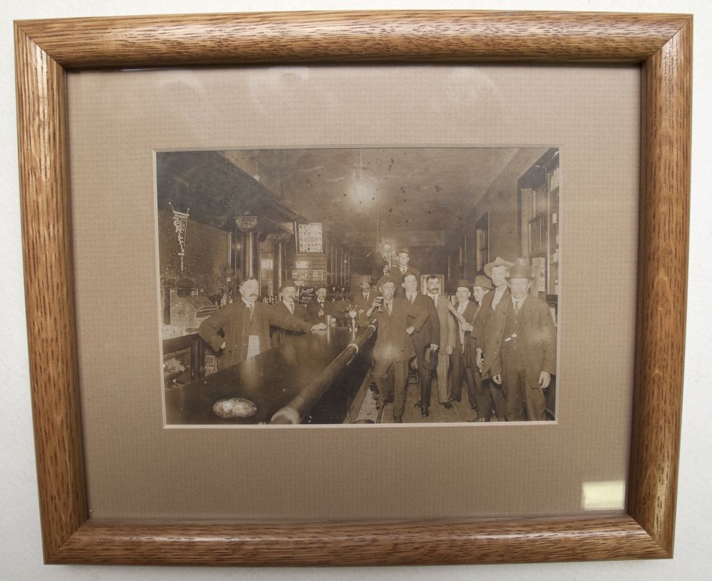 Three men serving nine patrons. We know this is a Sacramento Bar by the newspaper on the wall. Also on the wall: re-elect Judge Griffin, Jackson Beer, and Pabst Blue Ribbon.
