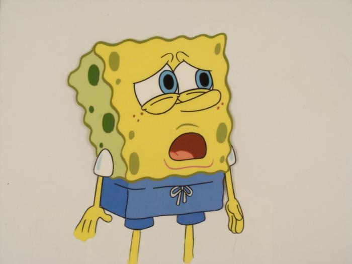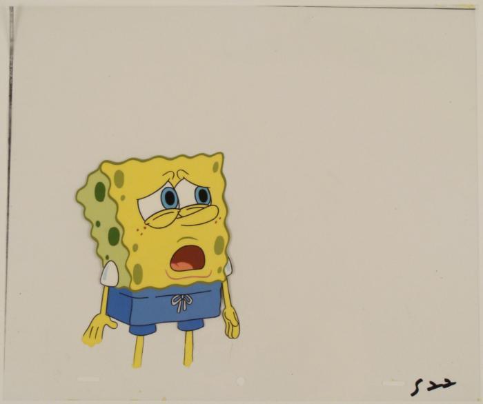 This original animation cel is from the Nickelodeon TV show SpongeBob Squarepants. The story takes place under the deep blue sea in Bikini Bottom, where SpongeBob resides. SpongeBob, who is a yellow, porous sponge, is your typical happy-go-lucky character, as he is always cheerful and enjoys making people laugh. Patrick Star, SpongeBob's neighbor who is a starfish, is your average children's show idiot, as he boasts knowing nothing and is often getting himself into ridiculous situations. Between the homes of these two lies the home of the miserable Squidward, a squid, who is known for being grouchy and playing tricks on SpongeBob and Patrick. Both SpongeBob and Squidward work at the Krusty Krab, a fast food business run by the greedy money-loving Mr. Krabs, a crab, the arch rival of the evil, possibly misunderstood, Plankton. Another neighbor, Sandy Cheeks, an athletic squirrel who normally wears an astronaut's space suit, was introduced in "Tea at the Treedome." She spends most of her time inventing and experimenting. SpongeBob appears to be sad.Original Production Animated Cel Overall Size of Cel: 10 1/2" x 12 1/2" Very Good ConditionThis is an original hand-painted cel set-up used in the production of an episode of "SpongeBob SquarePants." Each one-of-a-kind set-up represents a slight change in position of the characters. When individually photographed and projected in rapid succession, the images appear to move.