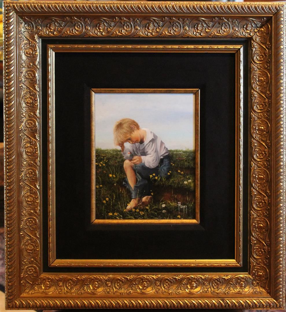 A little boy, sitting in a field of wild flowers with a long tear in his trousers is in deep concentration in David Player's oil on panel. The painting measures 10 x 8; framed image measures approx. 22 x 20.