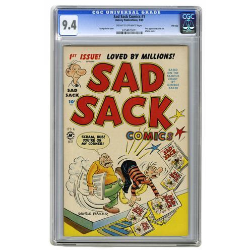 <B>Sad Sack Comics #1 File Copy (Harvey, 1949) CGC NM 9.4 Cream to off-white pages.</B></I> This amazing copy, which has been recently submitted to CGC, currently occupies the top spot in their census for this book. The reason Harvey fans will go to great lengths to get this issue: it's got the first appearance of Little Dot, who would go on to star in her own comic for over 20 years. But Sad Sack topped Dot when it came to longevity, as this series produced Harvey's longest continuous comic book title run, 287 issues! One reason why this first issue is hard to find is because it featured Sad Sack as a civilian, an unwelcome change at the time to fans who loved his adventures as a soldier and were loath to spend their dimes to see him in this new role. And that's despite a great infinity cover by George Baker! The swift kick to the pants shown here mirrors what most comic dealers would give anyone offering only the Guide price for a high-grade copy; for our part, we expect spirited bidding when this one comes up for auction. Overstreet 2006 NM- 9.2 value = $900. CGC census 3/06: 1 in 9.4, none higher.